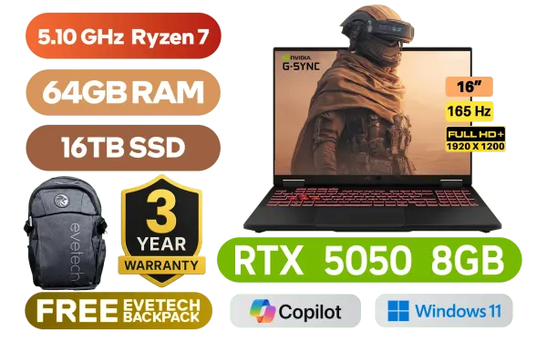 [G-SYNC] ASUS TUF Gaming A16 FA608UH AMD Ryzen 7 260 up to 5.10GHz Processor, 24MB Cache, 8x Cores, 16x Threads / 64GB DDR5 RAM / 16TB Ultra-Fast NVMe SSD / 16" FHD+ (1920x1200) Anti-Glare 165Hz IPS-Level Display / NVIDIA 50 Series GeForce RTX 5050 8GB GDDR7 Dedicated Graphics / Windows 11 Home (64bit) / 1080P FHD IR Camera / Bluetooth 5.3 / Realtek Wi-Fi 6E 8852CE Wireless LAN / 3 x USB Type-A / 2x USB Type C / 1 x HDMI 2.1 FRL / 1x Microphone and Headphone Combo jack / 1x RJ-45 / 1-Zone RGB Backlit Chiclet Keyboard / Dolby Atmos Audio with AI noise-canceling / ASUS TUF Gaming A16 Ryzen 7 RTX 5050 Gaming Laptop Deal[G-SYNC] ASUS TUF Gaming A16 FA608UH AMD Ryzen 7 260 up to 5.10GHz Processor, 24MB Cache, 8x Cores, 16x Threads / 64GB DDR5 RAM / 16TB Ultra-Fast NVMe SSD / 16" FHD+ (1920x1200) Anti-Glare 165Hz IPS-Level Display / NVIDIA 50 Series GeForce RTX 5050 8GB GDDR7 Dedicated Graphics / Windows 11 Home (64bit) / 1080P FHD IR Camera / Bluetooth 5.3 / Realtek Wi-Fi 6E 8852CE Wireless LAN / 3 x USB Type-A / 2x USB Type C / 1 x HDMI 2.1 FRL / 1x Microphone and Headphone Combo jack / 1x RJ-45 / 1-Zone RGB Backlit Chiclet Keyboard / Dolby Atmos Audio with AI noise-canceling / ASUS TUF Gaming A16 Ryzen 7 RTX 5050 Gaming Laptop Deal [FA608UH-716512G0W/64GB/16TB] / 3 YEARS WARRANTY / [+] GET FREE EVETECH FLUX Premium Gaming Backpack+ FREE DELIVERY !