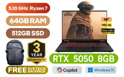 [G-SYNC] ASUS TUF Gaming A16 FA608UH AMD Ryzen 7 260 up to 5.10GHz Processor, 24MB Cache, 8x Cores, 16x Threads / 64GB DDR5 RAM / 512GB Ultra-Fast NVMe SSD / 16" FHD+ (1920x1200) Anti-Glare 165Hz IPS-Level Display / NVIDIA 50 Series GeForce RTX 5050 8GB GDDR7 Dedicated Graphics / Windows 11 Home (64bit) / 1080P FHD IR Camera / Bluetooth 5.3 / Realtek Wi-Fi 6E 8852CE Wireless LAN / 3 x USB Type-A / 2x USB Type C / 1 x HDMI 2.1 FRL / 1x Microphone and Headphone Combo jack / 1x RJ-45 / 1-Zone RGB Backlit Chiclet Keyboard / Dolby Atmos Audio with AI noise-canceling / ASUS TUF Gaming A16 Ryzen 7 RTX 5050 Gaming Laptop Deal[G-SYNC] ASUS TUF Gaming A16 FA608UH AMD Ryzen 7 260 up to 5.10GHz Processor, 24MB Cache, 8x Cores, 16x Threads / 64GB DDR5 RAM / 512GB Ultra-Fast NVMe SSD / 16" FHD+ (1920x1200) Anti-Glare 165Hz IPS-Level Display / NVIDIA 50 Series GeForce RTX 5050 8GB GDDR7 Dedicated Graphics / Windows 11 Home (64bit) / 1080P FHD IR Camera / Bluetooth 5.3 / Realtek Wi-Fi 6E 8852CE Wireless LAN / 3 x USB Type-A / 2x USB Type C / 1 x HDMI 2.1 FRL / 1x Microphone and Headphone Combo jack / 1x RJ-45 / 1-Zone RGB Backlit Chiclet Keyboard / Dolby Atmos Audio with AI noise-canceling / ASUS TUF Gaming A16 Ryzen 7 RTX 5050 Gaming Laptop Deal [FA608UH-716512G0W/64GB] / 3 YEARS WARRANTY / [+] GET FREE EVETECH FLUX Premium Gaming Backpack+ FREE DELIVERY !