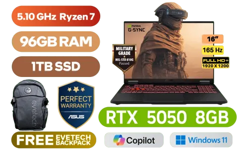 [G-SYNC] ASUS TUF Gaming A16 FA608UH AMD Ryzen 7 260 up to 5.10GHz Processor, 24MB Cache, 8x Cores, 16x Threads / 96GB DDR5 RAM / 1TB Ultra-Fast NVMe SSD / 16" FHD+ (1920x1200) Anti-Glare 165Hz IPS-Level Display / NVIDIA 50 Series GeForce RTX 5050 8GB GDDR7 Dedicated Graphics / Windows 11 Home (64bit) / 1080P FHD IR Camera / Bluetooth 5.3 / Realtek Wi-Fi 6E 8852CE Wireless LAN / 3 x USB Type-A / 2x USB Type C / 1 x HDMI 2.1 FRL / 1x Microphone and Headphone Combo jack / 1x RJ-45 / 1-Zone RGB Backlit Chiclet Keyboard / Dolby Atmos Audio with AI noise-canceling / ASUS TUF Gaming A16 Ryzen 7 RTX 5050 Gaming Laptop Deal[G-SYNC] ASUS TUF Gaming A16 FA608UH AMD Ryzen 7 260 up to 5.10GHz Processor, 24MB Cache, 8x Cores, 16x Threads / 96GB DDR5 RAM / 1TB Ultra-Fast NVMe SSD / 16" FHD+ (1920x1200) Anti-Glare 165Hz IPS-Level Display / NVIDIA 50 Series GeForce RTX 5050 8GB GDDR7 Dedicated Graphics / Windows 11 Home (64bit) / 1080P FHD IR Camera / Bluetooth 5.3 / Realtek Wi-Fi 6E 8852CE Wireless LAN / 3 x USB Type-A / 2x USB Type C / 1 x HDMI 2.1 FRL / 1x Microphone and Headphone Combo jack / 1x RJ-45 / 1-Zone RGB Backlit Chiclet Keyboard / Dolby Atmos Audio with AI noise-canceling / ASUS TUF Gaming A16 Ryzen 7 RTX 5050 Gaming Laptop Deal [FA608UH-716512G0W/96GB/1TB] / 3 YEARS WARRANTY / [+] GET FREE EVETECH FLUX Premium Gaming Backpack+ FREE DELIVERY !