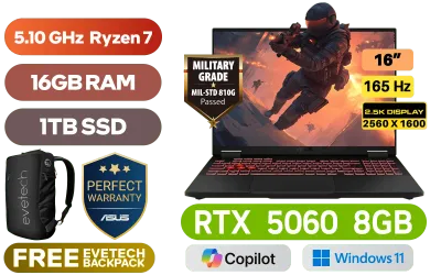 [G-SYNC] ASUS TUF Gaming A16 FA608UM AMD Ryzen 7 260 up to 5.10GHz Processor, 24MB Cache, 8x Cores, 16x Threads / 16GB DDR5 RAM / 1TB Ultra-Fast NVMe SSD / 16" 2.5K (2560x1600) Anti-Glare 165Hz, IPS-Level Display / NVIDIA 50 Series GeForce RTX 5060 8GB GDDR7 Dedicated Graphics / Windows 11 Home (64bit) / 1080P FHD IR Camera / Bluetooth 5.3 / Realtek Wi-Fi 6E 8852CE Wireless LAN / 3 x USB Type-A / 2x USB Type C (DisplayPort™) / 1 x HDMI / 1x Microphone and Headphone Combo jack / 1x RJ45 / RGB Backlit Chiclet Keyboard / Dolby Atmos Audio with AI noise-canceling / ASUS TUF Gaming A16 Ryzen 7 RTX 5060 Gaming Laptop Deal[G-SYNC] ASUS TUF Gaming A16 FA608UM AMD Ryzen 7 260 up to 5.10GHz Processor, 24MB Cache, 8x Cores, 16x Threads / 16GB DDR5 RAM / 1TB Ultra-Fast NVMe SSD / 16" 2.5K (2560x1600) Anti-Glare 165Hz, IPS-Level Display / NVIDIA 50 Series GeForce RTX 5060 8GB GDDR7 Dedicated Graphics / Windows 11 Home (64bit) / 1080P FHD IR Camera / Bluetooth 5.3 / Realtek Wi-Fi 6E 8852CE Wireless LAN / 3 x USB Type-A / 2x USB Type C (DisplayPort™) / 1 x HDMI / 1x Microphone and Headphone Combo jack / 1x RJ45 / RGB Backlit Chiclet Keyboard / Dolby Atmos Audio with AI noise-canceling / ASUS TUF Gaming A16 Ryzen 7 RTX 5060 Gaming Laptop Deal [FA608UM-716512G0W/1TB] / [+] GET FREE EVETECH NEO Premium Gaming Backpack / 3 YEARS WARRANTY + FREE DELIVERY !