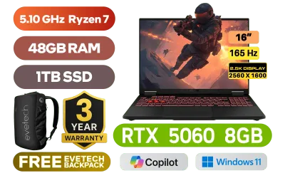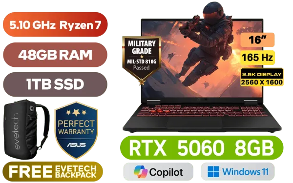 [G-SYNC] ASUS TUF Gaming A16 FA608UM AMD Ryzen 7 260 up to 5.10GHz Processor, 24MB Cache, 8x Cores, 16x Threads / 48GB DDR5 RAM / 1TB Ultra-Fast NVMe SSD / 16" 2.5K (2560x1600) Anti-Glare 165Hz, IPS-Level Display / NVIDIA 50 Series GeForce RTX 5060 8GB GDDR7 Dedicated Graphics / Windows 11 Home (64bit) / 1080P FHD IR Camera / Bluetooth 5.3 / Realtek Wi-Fi 6E 8852CE Wireless LAN / 3 x USB Type-A / 2x USB Type C (DisplayPort™) / 1 x HDMI / 1x Microphone and Headphone Combo jack / 1x RJ45 / RGB Backlit Chiclet Keyboard / Dolby Atmos Audio with AI noise-canceling / ASUS TUF Gaming A16 Ryzen 7 RTX 5060 Gaming Laptop Deal[G-SYNC] ASUS TUF Gaming A16 FA608UM AMD Ryzen 7 260 up to 5.10GHz Processor, 24MB Cache, 8x Cores, 16x Threads / 48GB DDR5 RAM / 1TB Ultra-Fast NVMe SSD / 16" 2.5K (2560x1600) Anti-Glare 165Hz, IPS-Level Display / NVIDIA 50 Series GeForce RTX 5060 8GB GDDR7 Dedicated Graphics / Windows 11 Home (64bit) / 1080P FHD IR Camera / Bluetooth 5.3 / Realtek Wi-Fi 6E 8852CE Wireless LAN / 3 x USB Type-A / 2x USB Type C (DisplayPort™) / 1 x HDMI / 1x Microphone and Headphone Combo jack / 1x RJ45 / RGB Backlit Chiclet Keyboard / Dolby Atmos Audio with AI noise-canceling / ASUS TUF Gaming A16 Ryzen 7 RTX 5060 Gaming Laptop Deal [FA608UM-716512G0W/48GB/1TB] / [+] GET FREE EVETECH NEO Premium Gaming Backpack / 3 YEARS WARRANTY + FREE DELIVERY !