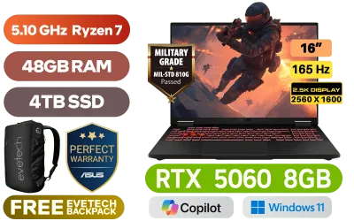 [G-SYNC] ASUS TUF Gaming A16 FA608UM AMD Ryzen 7 260 up to 5.10GHz Processor, 24MB Cache, 8x Cores, 16x Threads / 48GB DDR5 RAM / 4TB Ultra-Fast NVMe SSD / 16" 2.5K (2560x1600) Anti-Glare 165Hz, IPS-Level Display / NVIDIA 50 Series GeForce RTX 5060 8GB GDDR7 Dedicated Graphics / Windows 11 Home (64bit) / 1080P FHD IR Camera / Bluetooth 5.3 / Realtek Wi-Fi 6E 8852CE Wireless LAN / 3 x USB Type-A / 2x USB Type C (DisplayPort™) / 1 x HDMI / 1x Microphone and Headphone Combo jack / 1x RJ45 / RGB Backlit Chiclet Keyboard / Dolby Atmos Audio with AI noise-canceling / ASUS TUF Gaming A16 Ryzen 7 RTX 5060 Gaming Laptop Deal[G-SYNC] ASUS TUF Gaming A16 FA608UM AMD Ryzen 7 260 up to 5.10GHz Processor, 24MB Cache, 8x Cores, 16x Threads / 48GB DDR5 RAM / 4TB Ultra-Fast NVMe SSD / 16" 2.5K (2560x1600) Anti-Glare 165Hz, IPS-Level Display / NVIDIA 50 Series GeForce RTX 5060 8GB GDDR7 Dedicated Graphics / Windows 11 Home (64bit) / 1080P FHD IR Camera / Bluetooth 5.3 / Realtek Wi-Fi 6E 8852CE Wireless LAN / 3 x USB Type-A / 2x USB Type C (DisplayPort™) / 1 x HDMI / 1x Microphone and Headphone Combo jack / 1x RJ45 / RGB Backlit Chiclet Keyboard / Dolby Atmos Audio with AI noise-canceling / ASUS TUF Gaming A16 Ryzen 7 RTX 5060 Gaming Laptop Deal [FA608UM-716512G0W/48GB/4TB] / [+] GET FREE EVETECH NEO Premium Gaming Backpack / 3 YEARS WARRANTY + FREE DELIVERY !