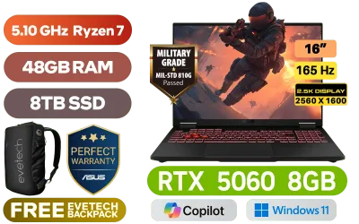 [G-SYNC] ASUS TUF Gaming A16 FA608UM AMD Ryzen 7 260 up to 5.10GHz Processor, 24MB Cache, 8x Cores, 16x Threads / 48GB DDR5 RAM / 8TB Ultra-Fast NVMe SSD / 16" 2.5K (2560x1600) Anti-Glare 165Hz, IPS-Level Display / NVIDIA 50 Series GeForce RTX 5060 8GB GDDR7 Dedicated Graphics / Windows 11 Home (64bit) / 1080P FHD IR Camera / Bluetooth 5.3 / Realtek Wi-Fi 6E 8852CE Wireless LAN / 3 x USB Type-A / 2x USB Type C (DisplayPort™) / 1 x HDMI / 1x Microphone and Headphone Combo jack / 1x RJ45 / RGB Backlit Chiclet Keyboard / Dolby Atmos Audio with AI noise-canceling / ASUS TUF Gaming A16 Ryzen 7 RTX 5060 Gaming Laptop Deal[G-SYNC] ASUS TUF Gaming A16 FA608UM AMD Ryzen 7 260 up to 5.10GHz Processor, 24MB Cache, 8x Cores, 16x Threads / 48GB DDR5 RAM / 8TB Ultra-Fast NVMe SSD / 16" 2.5K (2560x1600) Anti-Glare 165Hz, IPS-Level Display / NVIDIA 50 Series GeForce RTX 5060 8GB GDDR7 Dedicated Graphics / Windows 11 Home (64bit) / 1080P FHD IR Camera / Bluetooth 5.3 / Realtek Wi-Fi 6E 8852CE Wireless LAN / 3 x USB Type-A / 2x USB Type C (DisplayPort™) / 1 x HDMI / 1x Microphone and Headphone Combo jack / 1x RJ45 / RGB Backlit Chiclet Keyboard / Dolby Atmos Audio with AI noise-canceling / ASUS TUF Gaming A16 Ryzen 7 RTX 5060 Gaming Laptop Deal [FA608UM-716512G0W/48GB/8TB] / [+] GET FREE EVETECH NEO Premium Gaming Backpack / 3 YEARS WARRANTY + FREE DELIVERY !