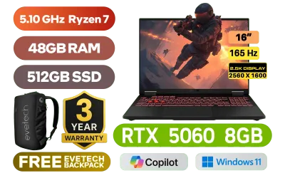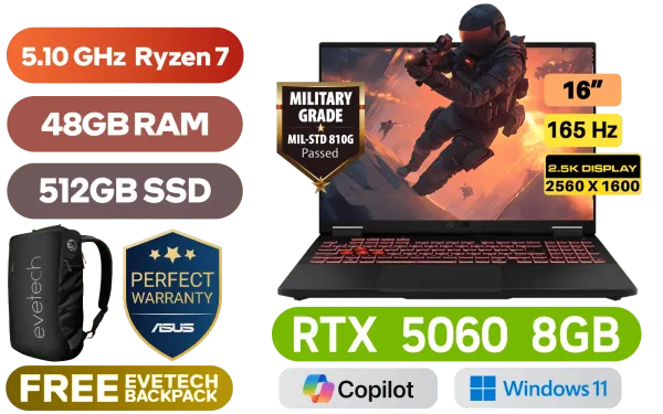 [G-SYNC] ASUS TUF Gaming A16 FA608UM AMD Ryzen 7 260 up to 5.10GHz Processor, 24MB Cache, 8x Cores, 16x Threads / 48GB DDR5 RAM / 512GB Ultra-Fast NVMe SSD / 16" 2.5K (2560x1600) Anti-Glare 165Hz, IPS-Level Display / NVIDIA 50 Series GeForce RTX 5060 8GB GDDR7 Dedicated Graphics / Windows 11 Home (64bit) / 1080P FHD IR Camera / Bluetooth 5.3 / Realtek Wi-Fi 6E 8852CE Wireless LAN / 3 x USB Type-A / 2x USB Type C (DisplayPort™) / 1 x HDMI / 1x Microphone and Headphone Combo jack / 1x RJ45 / RGB Backlit Chiclet Keyboard / Dolby Atmos Audio with AI noise-canceling / ASUS TUF Gaming A16 Ryzen 7 RTX 5060 Gaming Laptop Deal[G-SYNC] ASUS TUF Gaming A16 FA608UM AMD Ryzen 7 260 up to 5.10GHz Processor, 24MB Cache, 8x Cores, 16x Threads / 48GB DDR5 RAM / 512GB Ultra-Fast NVMe SSD / 16" 2.5K (2560x1600) Anti-Glare 165Hz, IPS-Level Display / NVIDIA 50 Series GeForce RTX 5060 8GB GDDR7 Dedicated Graphics / Windows 11 Home (64bit) / 1080P FHD IR Camera / Bluetooth 5.3 / Realtek Wi-Fi 6E 8852CE Wireless LAN / 3 x USB Type-A / 2x USB Type C (DisplayPort™) / 1 x HDMI / 1x Microphone and Headphone Combo jack / 1x RJ45 / RGB Backlit Chiclet Keyboard / Dolby Atmos Audio with AI noise-canceling / ASUS TUF Gaming A16 Ryzen 7 RTX 5060 Gaming Laptop Deal [FA608UM-716512G0W/48GB] / [+] GET FREE EVETECH NEO Premium Gaming Backpack / 3 YEARS WARRANTY + FREE DELIVERY !