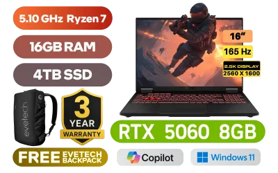 [G-SYNC] ASUS TUF Gaming A16 FA608UM AMD Ryzen 7 260 up to 5.10GHz Processor, 24MB Cache, 8x Cores, 16x Threads / 16GB DDR5 RAM / 4TB Ultra-Fast NVMe SSD / 16" 2.5K (2560x1600) Anti-Glare 165Hz, IPS-Level Display / NVIDIA 50 Series GeForce RTX 5060 8GB GDDR7 Dedicated Graphics / Windows 11 Home (64bit) / 1080P FHD IR Camera / Bluetooth 5.3 / Realtek Wi-Fi 6E 8852CE Wireless LAN / 3 x USB Type-A / 2x USB Type C (DisplayPort™) / 1 x HDMI / 1x Microphone and Headphone Combo jack / 1x RJ45 / RGB Backlit Chiclet Keyboard / Dolby Atmos Audio with AI noise-canceling / ASUS TUF Gaming A16 Ryzen 7 RTX 5060 Gaming Laptop Deal[G-SYNC] ASUS TUF Gaming A16 FA608UM AMD Ryzen 7 260 up to 5.10GHz Processor, 24MB Cache, 8x Cores, 16x Threads / 16GB DDR5 RAM / 4TB Ultra-Fast NVMe SSD / 16" 2.5K (2560x1600) Anti-Glare 165Hz, IPS-Level Display / NVIDIA 50 Series GeForce RTX 5060 8GB GDDR7 Dedicated Graphics / Windows 11 Home (64bit) / 1080P FHD IR Camera / Bluetooth 5.3 / Realtek Wi-Fi 6E 8852CE Wireless LAN / 3 x USB Type-A / 2x USB Type C (DisplayPort™) / 1 x HDMI / 1x Microphone and Headphone Combo jack / 1x RJ45 / RGB Backlit Chiclet Keyboard / Dolby Atmos Audio with AI noise-canceling / ASUS TUF Gaming A16 Ryzen 7 RTX 5060 Gaming Laptop Deal [FA608UM-716512G0W/4TB] / [+] GET FREE EVETECH NEO Premium Gaming Backpack / 3 YEARS WARRANTY + FREE DELIVERY !