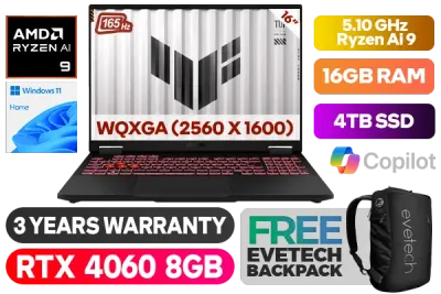 ASUS TUF Gaming A16 FA608WV AMD Ryzen AI 9 HX 370 up to 5.10GHz Processor, 36MB Cache, 12x Cores, 24x Threads / 16GB LPDDR5X RAM / 4TB Ultra-Fast NVMe SSD / 16" WQXGA (2560 x 1600) Anti-Glare 165Hz Display / NVIDIA 40 Series GeForce RTX 4060 8GB GDDR6 Dedicated Graphics / Windows 11 Home (64bit) / 1080P FHD IR Camera / Backlit Chiclet Keyboard 1-Zone RGB / Bluetooth 5.3 / Wi-Fi 6 Wireless LAN / 1 x RJ-45 / 2 x USB Type-A / 2x USB Type-C / 1 x HDMI / 1x Microphone and Headphone Combo jack / 2x speaker with Dolby Atmos Audio / ASUS TUF Gaming A16 Ryzen AI 9 RTX 4060 Gaming Laptop DealASUS TUF Gaming A16 FA608WV AMD Ryzen AI 9 HX 370 up to 5.10GHz Processor, 36MB Cache, 12x Cores, 24x Threads / 16GB LPDDR5X RAM / 4TB Ultra-Fast NVMe SSD / 16" WQXGA (2560 x 1600) Anti-Glare 165Hz Display / NVIDIA 40 Series GeForce RTX 4060 8GB GDDR6 Dedicated Graphics / Windows 11 Home (64bit) / 1080P FHD IR Camera / Backlit Chiclet Keyboard 1-Zone RGB / Bluetooth 5.3 / Wi-Fi 6 Wireless LAN / 1 x RJ-45 / 2 x USB Type-A / 2x USB Type-C / 1 x HDMI / 1x Microphone and Headphone Combo jack / 2x speaker with Dolby Atmos Audio / ASUS TUF Gaming A16 Ryzen AI 9 RTX 4060 Gaming Laptop Deal [FA608WV-91610G0W/4TB] / 3 YEARS WARRANTY / [+] GET FREE EVETECH NEO Premium Gaming Backpack+ FREE DELIVERY !
