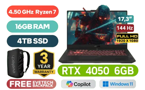 ASUS TUF Gaming A17 FA707NUR AMD Ryzen 7-7435HS up to 4.50GHz Processor, 20MB Cache, 8x Cores, 16x Threads / 16GB DDR5 RAM / 4TB Ultra-Fast NVMe SSD / 17.3" FHD (1920x1080) Anti-Glare 144Hz IPS Level Display / NVIDIA GeForce RTX 4050 6GB GDDR6 Dedicated Graphics / Windows 11 Home (64bit) / 720P HD Camera / Chiclet RGB Backlit Keyboard / Realtek 8852BE Wi-Fi 6 Wireless LAN / Bluetooth 5.3 / 2 x USB Type-A / 2x USB Type-C / 1x HDMI 2.1 / 1x Microphone and Headphone Combo jack / 1 x RJ45 / 2x speaker with Dolby Atmos Audio / ASUS TUF Gaming A17 Ryzen 7 RTX 4050 Gaming Laptop DealASUS TUF Gaming A17 FA707NUR AMD Ryzen 7-7435HS up to 4.50GHz Processor, 20MB Cache, 8x Cores, 16x Threads / 16GB DDR5 RAM / 4TB Ultra-Fast NVMe SSD / 17.3" FHD (1920x1080) Anti-Glare 144Hz IPS Level Display / NVIDIA GeForce RTX 4050 6GB GDDR6 Dedicated Graphics / Windows 11 Home (64bit) / 720P HD Camera / Chiclet RGB Backlit Keyboard / Realtek 8852BE Wi-Fi 6 Wireless LAN / Bluetooth 5.3 / 2 x USB Type-A / 2x USB Type-C / 1x HDMI 2.1 / 1x Microphone and Headphone Combo jack / 1 x RJ45 / 2x speaker with Dolby Atmos Audio / ASUS TUF Gaming A17 Ryzen 7 RTX 4050 Gaming Laptop Deal [FA707NUR-HX010W/16GB/4TB] / 3 YEARS WARRANTY / [+] GET FREE EVETECH NEO Premium Gaming Backpack+ FREE DELIVERY !