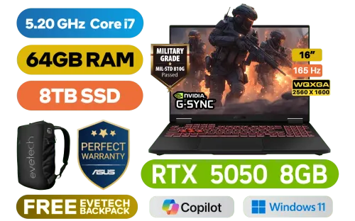 [G-SYNC] ASUS TUF Gaming F16 FX608JHR 14th Gen Intel® Core™ i7-14650HX up to 5.20GHz Processor, 30MB Cache, 16x Cores, 24x Threads / 64GB DDR5 RAM / 8TB Ultra-Fast NVMe SSD / 16" WQXGA(2560x1600) 165Hz, Anti-Glare IPS-Level Display / NVIDIA 50 Series GeForce RTX 5050 8GB GDDR7 Dedicated Graphics / Windows 11 Home (64bit) / Realtek Wi-Fi 6E 8852CE Wireless LAN / Bluetooth 5.3 / 1080P FHD IR Camera / 3 x USB Type-A / 2x USB Type-C (Supports Thunderbolt 4 / DisplayPort) / 1 x HDMI / 1x Microphone and Headphone Combo jack / 1x RJ-45 / RGB Backlit Chiclet Keyboard / Dolby Atmos Audio with AI noise-canceling / ASUS TUF Gaming F16 Intel Core i7 RTX 5050 Gaming Laptop Deal[G-SYNC] ASUS TUF Gaming F16 FX608JHR 14th Gen Intel® Core™ i7-14650HX up to 5.20GHz Processor, 30MB Cache, 16x Cores, 24x Threads / 64GB DDR5 RAM / 8TB Ultra-Fast NVMe SSD / 16" WQXGA(2560x1600) 165Hz, Anti-Glare IPS-Level Display / NVIDIA 50 Series GeForce RTX 5050 8GB GDDR7 Dedicated Graphics / Windows 11 Home (64bit) / Realtek Wi-Fi 6E 8852CE Wireless LAN / Bluetooth 5.3 / 1080P FHD IR Camera / 3 x USB Type-A / 2x USB Type-C (Supports Thunderbolt 4 / DisplayPort) / 1 x HDMI / 1x Microphone and Headphone Combo jack / 1x RJ-45 / RGB Backlit Chiclet Keyboard / Dolby Atmos Audio with AI noise-canceling / ASUS TUF Gaming F16 Intel Core i7 RTX 5050 Gaming Laptop Deal [FX608JHR-I716512G0W/64GB/8TB] / 3 YEARS WARRANTY / [+] GET FREE EVETECH NEO Premium Gaming Backpack+ FREE DELIVERY !