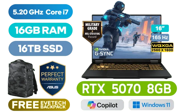 [G-SYNC] ASUS TUF Gaming F16 FX608JPR 14th Gen Intel Core i7-14650HX up to 5.20GHz Processor, 30MB Cache, 16x Cores, 24x Threads / 16GB DDR5 RAM / 16TB Ultra-Fast NVMe SSD / 16" WQXGA (2560 x 1600) 165Hz, IPS-level Display / NVIDIA GeForce RTX 5070 8GB GDDR7 Dedicated Graphics / Windows 11 Home (64bit) / Intel Wi-Fi 6 AX211 Wireless LAN / Bluetooth 5.4 / 1080P FHD IR Camera / 3x USB Type-A / 2x USB Type-C (Supports Thunderbolt 4 / DisplayPort™) / 1x Headphone & Microphone Combo Jack / 1x HDMI / 1x RJ-45 / RGB Backlit Keyboard / Dolby Atmos Audio system with AI noise-cancelling / ASUS TUF Gaming F16 FX608JPR Intel Core i7 RTX 5070 Gaming Laptop[G-SYNC] ASUS TUF Gaming F16 FX608JPR 14th Gen Intel Core i7-14650HX up to 5.20GHz Processor, 30MB Cache, 16x Cores, 24x Threads / 16GB DDR5 RAM / 16TB Ultra-Fast NVMe SSD / 16" WQXGA (2560 x 1600) 165Hz, IPS-level Display / NVIDIA GeForce RTX 5070 8GB GDDR7 Dedicated Graphics / Windows 11 Home (64bit) / Intel Wi-Fi 6 AX211 Wireless LAN / Bluetooth 5.4 / 1080P FHD IR Camera / 3x USB Type-A / 2x USB Type-C (Supports Thunderbolt 4 / DisplayPort™) / 1x Headphone & Microphone Combo Jack / 1x HDMI / 1x RJ-45 / RGB Backlit Keyboard / Dolby Atmos Audio system with AI noise-cancelling / ASUS TUF Gaming F16 FX608JPR Intel Core i7 RTX 5070 Gaming Laptop [FX608JPR-I71610G0W/16TB] / [+] GET FREE EVETECH DASH Premium Gaming Backpack / 3 YEARS WARRANTY / [+]Get Resident Evil: Requiem with select GeForce RTX 50 Series (Standard Edition)+ FREE DELIVERY !