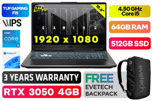 ASUS TUF Gaming F15 11th Gen Intel Core i5-11400H up to 4.50GHz Processor, 24MB Cache, 6x Cores, 12x Threads / 64GB DDR4 RAM / 512GB Ultra-Fast NVME SSD / 15.6" FHD 1920x1080 Anti-Glare 144Hz IPS Level Display / NVIDIA GeForce RTX 3050 4GB GDDR6 Dedicated Graphics / Windows 11 Home (64bit) / Wi-Fi 6 Wireless LAN / Bluetooth 5.2 / 720p HD Web Camera With Array microphone / Backlit Chiclet <span style="font-size: 20px; color: rgb(255, 0, 0);">R</span><span style="font-size: 20px; color: rgb(51, 153, 0);">G</span><span style="font-size: 20px; color: rgb(51, 102, 255);">B</span></span> Keyboard / DTS 7.1-channel Virtual Surround Sound / 2 x 2W Speakers / 1 x HDMI / 3x USB 3.2 Type-A / 1x USB 3.2 Gen 2 Type-C / 1x Headphone-out & Audio-in Combo Jack / ASUS TUF Gaming F15 Core i5 RTX 3050 Gaming Laptop DealASUS TUF Gaming F15 11th Gen Intel Core i5-11400H up to 4.50GHz Processor, 24MB Cache, 6x Cores, 12x Threads / 64GB DDR4 RAM / 512GB Ultra-Fast NVME SSD / 15.6" FHD 1920x1080 Anti-Glare 144Hz IPS Level Display / NVIDIA GeForce RTX 3050 4GB GDDR6 Dedicated Graphics / Windows 11 Home (64bit) / Wi-Fi 6 Wireless LAN / Bluetooth 5.2 / 720p HD Web Camera With Array microphone / Backlit Chiclet RGB Keyboard / DTS 7.1-channel Virtual Surround Sound / 2 x 2W Speakers / 1 x HDMI / 3x USB 3.2 Type-A / 1x USB 3.2 Gen 2 Type-C / 1x Headphone-out & Audio-in Combo Jack / ASUS TUF Gaming F15 Core i5 RTX 3050 Gaming Laptop Deal [FX506HCB-I58512B0W/64GB] / 3 YEARS WARRANTY / [+] GET FREE EVETECH NEO Premium Gaming Backpack+ FREE DELIVERY !