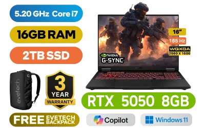 [G-SYNC] ASUS TUF Gaming F16 FX608JHR 14th Gen Intel® Core™ i7-14650HX up to 5.20GHz Processor, 30MB Cache, 16x Cores, 24x Threads / 16GB DDR5 RAM / 2TB Ultra-Fast NVMe SSD / 16" WQXGA(2560x1600) 165Hz, Anti-Glare IPS-Level Display / NVIDIA 50 Series GeForce RTX 5050 8GB GDDR7 Dedicated Graphics / Windows 11 Home (64bit) / Realtek Wi-Fi 6E 8852CE Wireless LAN / Bluetooth 5.3 / 1080P FHD IR Camera / 3 x USB Type-A / 2x USB Type-C (Supports Thunderbolt 4 / DisplayPort) / 1 x HDMI / 1x Microphone and Headphone Combo jack / 1x RJ-45 / RGB Backlit Chiclet Keyboard / Dolby Atmos Audio with AI noise-canceling / ASUS TUF Gaming F16 Intel Core i7 RTX 5050 Gaming Laptop Deal[G-SYNC] ASUS TUF Gaming F16 FX608JHR 14th Gen Intel® Core™ i7-14650HX up to 5.20GHz Processor, 30MB Cache, 16x Cores, 24x Threads / 16GB DDR5 RAM / 2TB Ultra-Fast NVMe SSD / 16" WQXGA(2560x1600) 165Hz, Anti-Glare IPS-Level Display / NVIDIA 50 Series GeForce RTX 5050 8GB GDDR7 Dedicated Graphics / Windows 11 Home (64bit) / Realtek Wi-Fi 6E 8852CE Wireless LAN / Bluetooth 5.3 / 1080P FHD IR Camera / 3 x USB Type-A / 2x USB Type-C (Supports Thunderbolt 4 / DisplayPort) / 1 x HDMI / 1x Microphone and Headphone Combo jack / 1x RJ-45 / RGB Backlit Chiclet Keyboard / Dolby Atmos Audio with AI noise-canceling / ASUS TUF Gaming F16 Intel Core i7 RTX 5050 Gaming Laptop Deal [FX608JHR-I716512G0W/2TB] / 3 YEARS WARRANTY / [+] GET FREE EVETECH NEO Premium Gaming Backpack+ FREE DELIVERY !