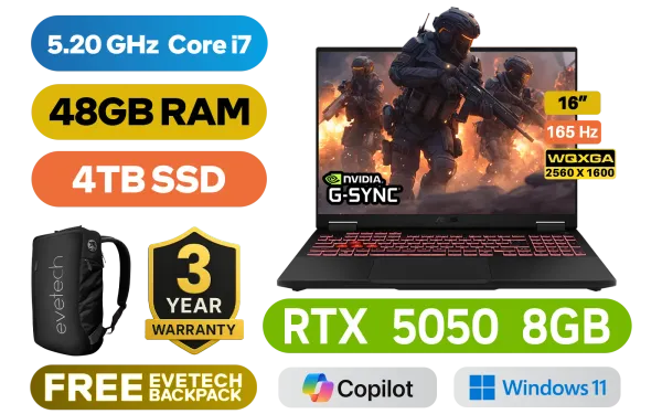 [G-SYNC] ASUS TUF Gaming F16 FX608JHR 14th Gen Intel® Core™ i7-14650HX up to 5.20GHz Processor, 30MB Cache, 16x Cores, 24x Threads / 48GB DDR5 RAM / 4TB Ultra-Fast NVMe SSD / 16" WQXGA(2560x1600) 165Hz, Anti-Glare IPS-Level Display / NVIDIA 50 Series GeForce RTX 5050 8GB GDDR7 Dedicated Graphics / Windows 11 Home (64bit) / Realtek Wi-Fi 6E 8852CE Wireless LAN / Bluetooth 5.3 / 1080P FHD IR Camera / 3 x USB Type-A / 2x USB Type-C (Supports Thunderbolt 4 / DisplayPort) / 1 x HDMI / 1x Microphone and Headphone Combo jack / 1x RJ-45 / RGB Backlit Chiclet Keyboard / Dolby Atmos Audio with AI noise-canceling / ASUS TUF Gaming F16 Intel Core i7 RTX 5050 Gaming Laptop Deal[G-SYNC] ASUS TUF Gaming F16 FX608JHR 14th Gen Intel® Core™ i7-14650HX up to 5.20GHz Processor, 30MB Cache, 16x Cores, 24x Threads / 48GB DDR5 RAM / 4TB Ultra-Fast NVMe SSD / 16" WQXGA(2560x1600) 165Hz, Anti-Glare IPS-Level Display / NVIDIA 50 Series GeForce RTX 5050 8GB GDDR7 Dedicated Graphics / Windows 11 Home (64bit) / Realtek Wi-Fi 6E 8852CE Wireless LAN / Bluetooth 5.3 / 1080P FHD IR Camera / 3 x USB Type-A / 2x USB Type-C (Supports Thunderbolt 4 / DisplayPort) / 1 x HDMI / 1x Microphone and Headphone Combo jack / 1x RJ-45 / RGB Backlit Chiclet Keyboard / Dolby Atmos Audio with AI noise-canceling / ASUS TUF Gaming F16 Intel Core i7 RTX 5050 Gaming Laptop Deal [FX608JHR-I716512G0W/48GB/4TB] / 3 YEARS WARRANTY / [+] GET FREE EVETECH NEO Premium Gaming Backpack+ FREE DELIVERY !