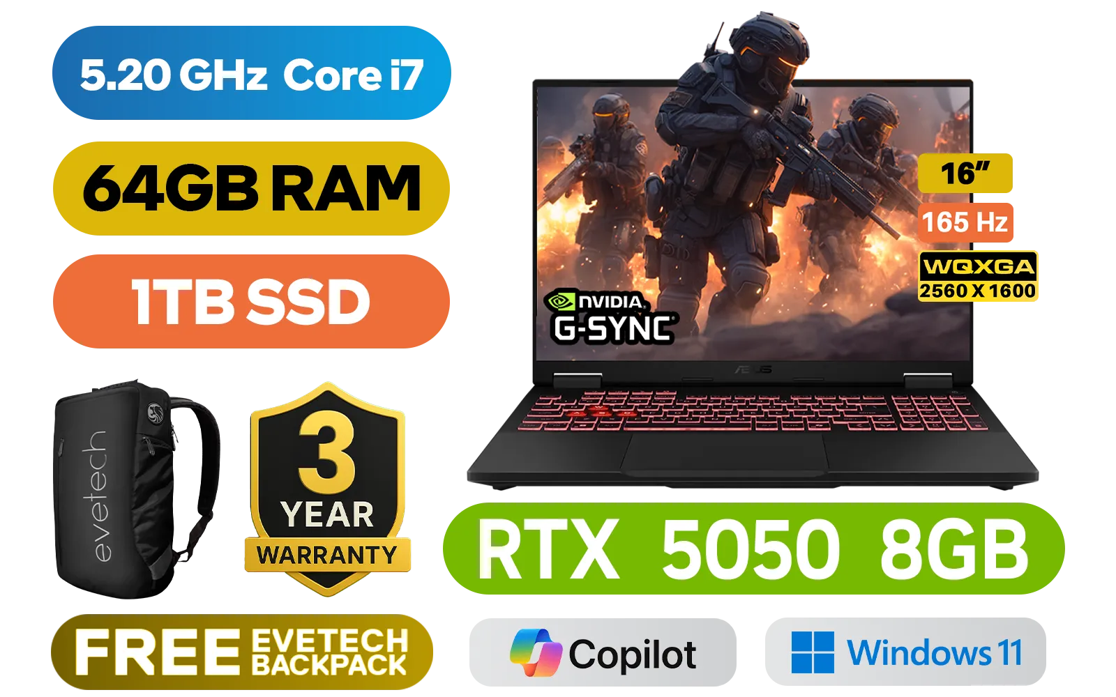 [G-SYNC] ASUS TUF Gaming F16 FX608JHR 14th Gen Intel® Core™ i7-14650HX up to 5.20GHz Processor, 30MB Cache, 16x Cores, 24x Threads / 64GB DDR5 RAM / 1TB Ultra-Fast NVMe SSD / 16" WQXGA(2560x1600) 165Hz, Anti-Glare IPS-Level Display / NVIDIA 50 Series GeForce RTX 5050 8GB GDDR7 Dedicated Graphics / Windows 11 Home (64bit) / Realtek Wi-Fi 6E 8852CE Wireless LAN / Bluetooth 5.3 / 1080P FHD IR Camera / 3 x USB Type-A / 2x USB Type-C (Supports Thunderbolt 4 / DisplayPort) / 1 x HDMI / 1x Microphone and Headphone Combo jack / 1x RJ-45 / RGB Backlit Chiclet Keyboard / Dolby Atmos Audio with AI noise-canceling / ASUS TUF Gaming F16 Intel Core i7 RTX 5050 Gaming Laptop Deal[G-SYNC] ASUS TUF Gaming F16 FX608JHR 14th Gen Intel® Core™ i7-14650HX up to 5.20GHz Processor, 30MB Cache, 16x Cores, 24x Threads / 64GB DDR5 RAM / 1TB Ultra-Fast NVMe SSD / 16" WQXGA(2560x1600) 165Hz, Anti-Glare IPS-Level Display / NVIDIA 50 Series GeForce RTX 5050 8GB GDDR7 Dedicated Graphics / Windows 11 Home (64bit) / Realtek Wi-Fi 6E 8852CE Wireless LAN / Bluetooth 5.3 / 1080P FHD IR Camera / 3 x USB Type-A / 2x USB Type-C (Supports Thunderbolt 4 / DisplayPort) / 1 x HDMI / 1x Microphone and Headphone Combo jack / 1x RJ-45 / RGB Backlit Chiclet Keyboard / Dolby Atmos Audio with AI noise-canceling / ASUS TUF Gaming F16 Intel Core i7 RTX 5050 Gaming Laptop Deal [FX608JHR-I716512G0W/64GB/1TB] / 3 YEARS WARRANTY / [+] GET FREE EVETECH NEO Premium Gaming Backpack+ FREE DELIVERY !