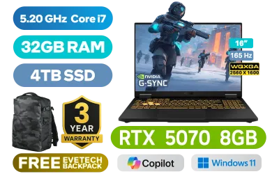 [G-SYNC] ASUS TUF Gaming F16 FX608JPR 14th Gen Intel Core i7-14650HX up to 5.20GHz Processor, 30MB Cache, 16x Cores, 24x Threads / 32GB DDR5 RAM / 4TB Ultra-Fast NVMe SSD / 16" WQXGA (2560 x 1600) 165Hz, IPS-level Display / NVIDIA GeForce RTX 5070 8GB GDDR7 Dedicated Graphics / Windows 11 Home (64bit) / Intel Wi-Fi 6 AX211 Wireless LAN / Bluetooth 5.4 / 1080P FHD IR Camera / 3x USB Type-A / 2x USB Type-C (Supports Thunderbolt 4 / DisplayPort™) / 1x Headphone & Microphone Combo Jack / 1x HDMI / 1x RJ-45 / RGB Backlit Keyboard / Dolby Atmos Audio system with AI noise-cancelling / ASUS TUF Gaming F16 FX608JPR Intel Core i7 RTX 5070 Gaming Laptop[G-SYNC] ASUS TUF Gaming F16 FX608JPR 14th Gen Intel Core i7-14650HX up to 5.20GHz Processor, 30MB Cache, 16x Cores, 24x Threads / 32GB DDR5 RAM / 4TB Ultra-Fast NVMe SSD / 16" WQXGA (2560 x 1600) 165Hz, IPS-level Display / NVIDIA GeForce RTX 5070 8GB GDDR7 Dedicated Graphics / Windows 11 Home (64bit) / Intel Wi-Fi 6 AX211 Wireless LAN / Bluetooth 5.4 / 1080P FHD IR Camera / 3x USB Type-A / 2x USB Type-C (Supports Thunderbolt 4 / DisplayPort™) / 1x Headphone & Microphone Combo Jack / 1x HDMI / 1x RJ-45 / RGB Backlit Keyboard / Dolby Atmos Audio system with AI noise-cancelling / ASUS TUF Gaming F16 FX608JPR Intel Core i7 RTX 5070 Gaming Laptop [FX608JPR-I71610G0W/32GB/4TB] / [+] GET FREE EVETECH DASH Premium Gaming Backpack / 3 YEARS WARRANTY / [+]Get Resident Evil Requiem with select GeForce RTX 50 Series (Standard Edition)+ FREE DELIVERY !