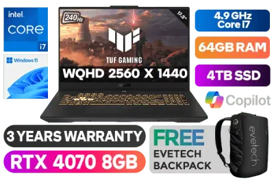 ASUS TUF Gaming F17 FX707VI Intel Core i7-13620H up to 4.9GHz Processor, 24MB Cache, 10x Cores, 16x Threads / 64GB DDR5 RAM / 4TB Ultra-Fast NVMe SSD / 17.3" WQHD 2560x1440 Anti-Glare 240Hz, IPS Level G-SYNC Display / NVIDIA GeForce RTX 4070 8GB GDDR6 Dedicated Graphics / Windows 11 Home (64bit) / Intel Wi-Fi 6 Wireless LAN / Bluetooth v5.3 / 720P HD camera / 1x USB 3.2 Type-C support DisplayPort / 1x USB Type-C Thunderbolt 4 support DisplayPort / 2x USB 3.2 Type-A / 1x HDMI / 1x RJ45 / 1x Headphone & Microphone Combo Jack / RGB Backlit Keyboard / Dolby Atmos Sound System / ASUS TUF Gaming F17 Core i7 RTX 4070 Gaming Laptop DealASUS TUF Gaming F17 FX707VI Intel Core i7-13620H up to 4.9GHz Processor, 24MB Cache, 10x Cores, 16x Threads / 64GB DDR5 RAM / 4TB Ultra-Fast NVMe SSD / 17.3" WQHD 2560x1440 Anti-Glare 240Hz, IPS Level G-SYNC Display / NVIDIA GeForce RTX 4070 8GB GDDR6 Dedicated Graphics / Windows 11 Home (64bit) / Intel Wi-Fi 6 Wireless LAN / Bluetooth v5.3 / 720P HD camera / 1x USB 3.2 Type-C support DisplayPort / 1x USB Type-C Thunderbolt 4 support DisplayPort / 2x USB 3.2 Type-A / 1x HDMI / 1x RJ45 / 1x Headphone & Microphone Combo Jack / RGB Backlit Keyboard / Dolby Atmos Sound System / ASUS TUF Gaming F17 Core i7 RTX 4070 Gaming Laptop Deal [FX707VI-I71610G0W/64GB/4TB] / 3 YEARS WARRANTY / [+] GET FREE EVETECH NEO Premium Gaming Backpack+ FREE DELIVERY !