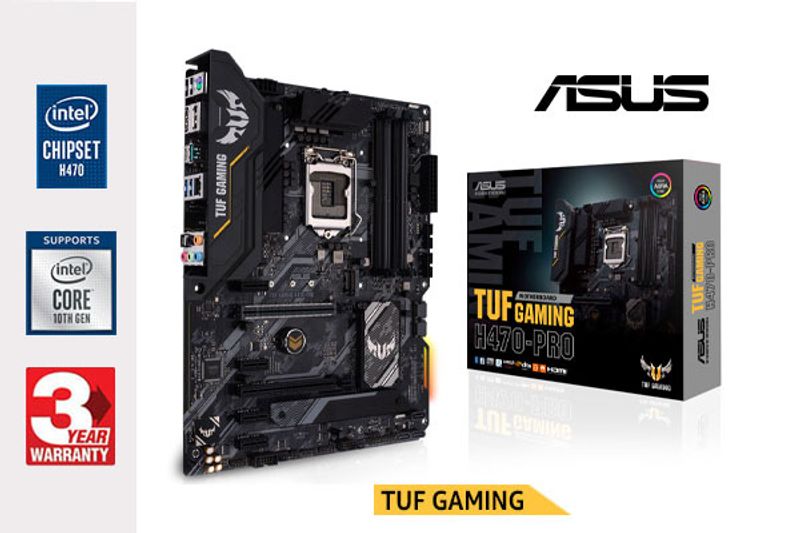 ASUS TUF GAMING H470-PRO Intel ATX Motherboard / Intel H470 Chipset / Supports 10th And 11th Gen Processors / LGA 1200 Socket / Aura Sync RGB Lighting / Supports 2 x M.2 Slots and 6 x SATA 6Gb/s Ports / USB 3.2 Gen 1 / 1x USB 3.2 Gen 2 Type-C / Comprehensive cooling / Realtek S1200A Codec