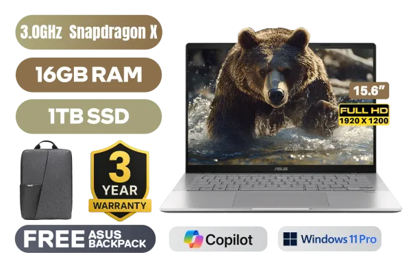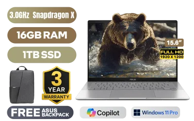 ASUS Vivobook 14 S3407QA Snapdragon X1-26-100 up to 3.GHz Processor, 30MB Cache, 8x Cores, 8x Threads / 16GB LPDDR5x RAM / 1TB Ultra-Fast NVMe SSD / 15.6" FHD (1920x1200) OLED Display / Integrated Qualcomm Adreno X1-45 Graphics / <span style="font-size: 20px; color: #00BFFF; font-weight: bold;">Windows 11 Professional (64bit)</span> / Qualcomm FastConnect 6900 WiFi 6E Wireless LAN / Bluetooth 5.3 / HD IR Camera with Privacy Shutter / 2x USB Type-A / 2x USB Type-C (Supports DisplayPort / Power Delivery) / 1x HDMI / 1x Microphone & Headphone Combo Jack / White Backlit Keyboard / SonicMaster Audio / Free Asus Bag / ASUS Vivobook 14 S3407QA Snapdragon X1 Laptop DealASUS Vivobook 14 S3407QA Snapdragon X1-26-100 up to 3.GHz Processor, 30MB Cache, 8x Cores, 8x Threads / 16GB LPDDR5x RAM / 1TB Ultra-Fast NVMe SSD / 15.6" FHD (1920x1200) OLED Display / Integrated Qualcomm Adreno X1-45 Graphics / Windows 11 Professional (64bit) / Qualcomm FastConnect 6900 WiFi 6E Wireless LAN / Bluetooth 5.3 / HD IR Camera with Privacy Shutter / 2x USB Type-A / 2x USB Type-C (Supports DisplayPort / Power Delivery) / 1x HDMI / 1x Microphone & Headphone Combo Jack / White Backlit Keyboard / SonicMaster Audio / Free Asus Bag / ASUS Vivobook 14 S3407QA Snapdragon X1 Laptop Deal [S3407QA-OQ1610S0X] / 3 YEARS WARRANTY + FREE DELIVERY !