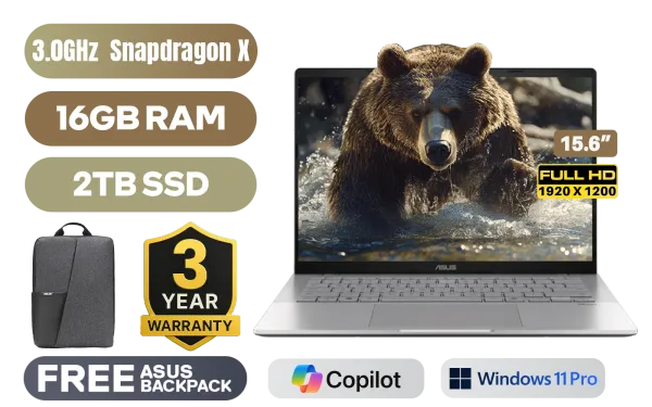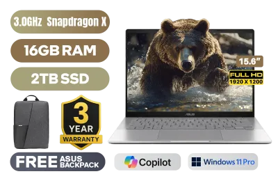 ASUS Vivobook 14 S3407QA Snapdragon X1-26-100 up to 3.GHz Processor, 30MB Cache, 8x Cores, 8x Threads / 16GB LPDDR5x RAM / 2TB Ultra-Fast NVMe SSD / 15.6" FHD (1920x1200) OLED Display / Integrated Qualcomm Adreno X1-45 Graphics / <span style="font-size: 20px; color: #00BFFF; font-weight: bold;">Windows 11 Professional (64bit)</span> / Qualcomm FastConnect 6900 WiFi 6E Wireless LAN / Bluetooth 5.3 / HD IR Camera with Privacy Shutter / 2x USB Type-A / 2x USB Type-C (Supports DisplayPort / Power Delivery) / 1x HDMI / 1x Microphone & Headphone Combo Jack / White Backlit Keyboard / SonicMaster Audio / Free Asus Bag / ASUS Vivobook 14 S3407QA Snapdragon X1 Laptop DealASUS Vivobook 14 S3407QA Snapdragon X1-26-100 up to 3.GHz Processor, 30MB Cache, 8x Cores, 8x Threads / 16GB LPDDR5x RAM / 2TB Ultra-Fast NVMe SSD / 15.6" FHD (1920x1200) OLED Display / Integrated Qualcomm Adreno X1-45 Graphics / Windows 11 Professional (64bit) / Qualcomm FastConnect 6900 WiFi 6E Wireless LAN / Bluetooth 5.3 / HD IR Camera with Privacy Shutter / 2x USB Type-A / 2x USB Type-C (Supports DisplayPort / Power Delivery) / 1x HDMI / 1x Microphone & Headphone Combo Jack / White Backlit Keyboard / SonicMaster Audio / Free Asus Bag / ASUS Vivobook 14 S3407QA Snapdragon X1 Laptop Deal [S3407QA-OQ1610S0X/2TB] / 3 YEARS WARRANTY + FREE DELIVERY !