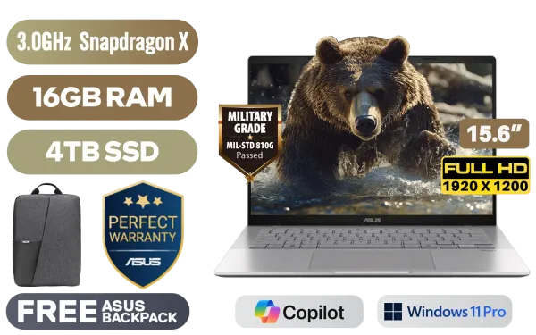 ASUS Vivobook 14 S3407QA Snapdragon X1-26-100 up to 3.GHz Processor, 30MB Cache, 8x Cores, 8x Threads / 16GB LPDDR5x RAM / 4TB Ultra-Fast NVMe SSD / 15.6" FHD (1920x1200) OLED Display / Integrated Qualcomm Adreno X1-45 Graphics / <span style="font-size: 20px; color: #00BFFF; font-weight: bold;">Windows 11 Professional (64bit)</span> / Qualcomm FastConnect 6900 WiFi 6E Wireless LAN / Bluetooth 5.3 / HD IR Camera with Privacy Shutter / 2x USB Type-A / 2x USB Type-C (Supports DisplayPort / Power Delivery) / 1x HDMI / 1x Microphone & Headphone Combo Jack / White Backlit Keyboard / SonicMaster Audio / Free Asus Bag / ASUS Vivobook 14 S3407QA Snapdragon X1 Laptop DealASUS Vivobook 14 S3407QA Snapdragon X1-26-100 up to 3.GHz Processor, 30MB Cache, 8x Cores, 8x Threads / 16GB LPDDR5x RAM / 4TB Ultra-Fast NVMe SSD / 15.6" FHD (1920x1200) OLED Display / Integrated Qualcomm Adreno X1-45 Graphics / Windows 11 Professional (64bit) / Qualcomm FastConnect 6900 WiFi 6E Wireless LAN / Bluetooth 5.3 / HD IR Camera with Privacy Shutter / 2x USB Type-A / 2x USB Type-C (Supports DisplayPort / Power Delivery) / 1x HDMI / 1x Microphone & Headphone Combo Jack / White Backlit Keyboard / SonicMaster Audio / Free Asus Bag / ASUS Vivobook 14 S3407QA Snapdragon X1 Laptop Deal [S3407QA-OQ1610S0X/4TB] / 3 YEARS WARRANTY + FREE DELIVERY !
