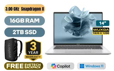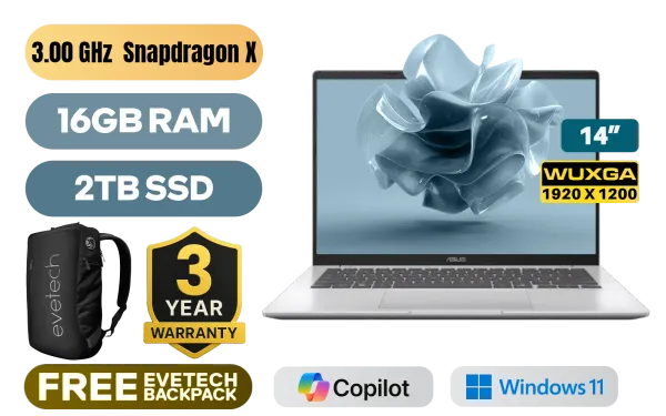 ASUS Vivobook 14 Snapdragon X X1-26-100 up to 3.00GHz Processor, 30MB Cache, 8x Cores / 16GB LPDDR5X RAM / 2TB Ultra-Fast NVMe SSD / 14" WUXGA (1920X1200) Anti-glare IPS-Level Display / Qualcomm Adreno Graphics / Windows 11 Home (64bit) / Qualcomm FastConnect 6500 Wi-Fi 6E Wireless LAN / Bluetooth 5.3 / 1080p FHD IR Camera with Privacy Shutter / 2x USB Type-A / 2x USB Type-C (with support for display / power delivery) / 1 x HDMI / 1x Microphone and Headphone Combo jack / White Backlit Keyboard / SonicMaster Audio / ASUS Vivobook 14 Snapdragon X Laptop DealASUS Vivobook 14 Snapdragon X X1-26-100 up to 3.00GHz Processor, 30MB Cache, 8x Cores / 16GB LPDDR5X RAM / 2TB Ultra-Fast NVMe SSD / 14" WUXGA (1920X1200) Anti-glare IPS-Level Display / Qualcomm Adreno Graphics / Windows 11 Home (64bit) / Qualcomm FastConnect 6500 Wi-Fi 6E Wireless LAN / Bluetooth 5.3 / 1080p FHD IR Camera with Privacy Shutter / 2x USB Type-A / 2x USB Type-C (with support for display / power delivery) / 1 x HDMI / 1x Microphone and Headphone Combo jack / White Backlit Keyboard / SonicMaster Audio / ASUS Vivobook 14 Snapdragon X Laptop Deal [X1407QA-Q16512S0W/2TB] / [+] GET FREE EVETECH NEO Premium Gaming Backpack / 3 YEARS WARRANTY / [+] GET FREE Logitech M185 Wireless Mouse+ FREE DELIVERY !