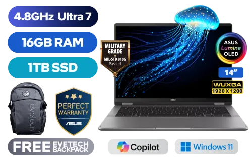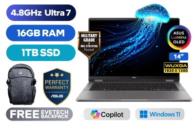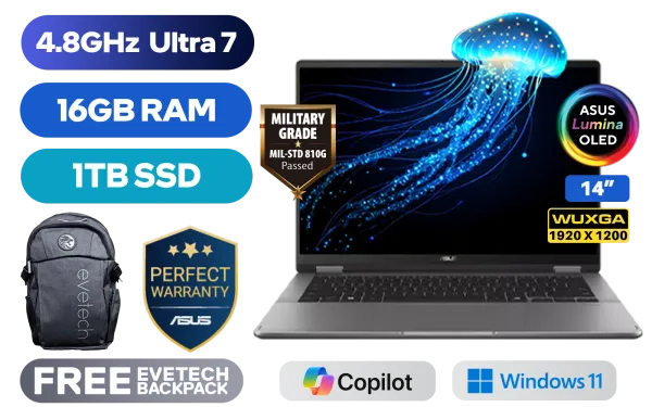 [TOUCHSCREEN] ASUS Vivobook 14 TP3407 Intel® Core™ Ultra 7-256V up to 4.8GHz Processor, 12MB Cache, 8x Cores, 8x Threads / 16GB LPDDR5X RAM / 1TB Ultra-Fast NVMe SSD / 14" WUXGA (1920x1200) OLED Display / Integrated Intel Arc 140V Graphics / Windows 11 Home (64bit) / Intel WiFi 7 BE201 Wireless LAN / Bluetooth 5.4 / FHD IR Camera with Privacy Shutter / 1x USB Type-A / 2x USB Type-C (Supports Thunderbolt 4 / DisplayPort / Power Delivery) / 1x HDMI / 1x Microphone & Headphone Combo Jack / Micro SD Card Reader / White Backlit Keyboard / SonicMaster Audio / Free Asus Pen / ASUS Vivobook 14 Flip TP3407 Core Ultra 7 Laptop Deal[TOUCHSCREEN] ASUS Vivobook 14 TP3407 Intel® Core™ Ultra 7-256V up to 4.8GHz Processor, 12MB Cache, 8x Cores, 8x Threads / 16GB LPDDR5X RAM / 1TB Ultra-Fast NVMe SSD / 14" WUXGA (1920x1200) OLED Display / Integrated Intel Arc 140V Graphics / Windows 11 Home (64bit) / Intel WiFi 7 BE201 Wireless LAN / Bluetooth 5.4 / FHD IR Camera with Privacy Shutter / 1x USB Type-A / 2x USB Type-C (Supports Thunderbolt 4 / DisplayPort / Power Delivery) / 1x HDMI / 1x Microphone & Headphone Combo Jack / Micro SD Card Reader / White Backlit Keyboard / SonicMaster Audio / Free Asus Pen / ASUS Vivobook 14 Flip TP3407 Core Ultra 7 Laptop Deal [TP3407SA-OU71610G1W] / [+] GET FREE EVETECH FLUX Premium Gaming Backpack / 3 YEARS WARRANTY + FREE DELIVERY !