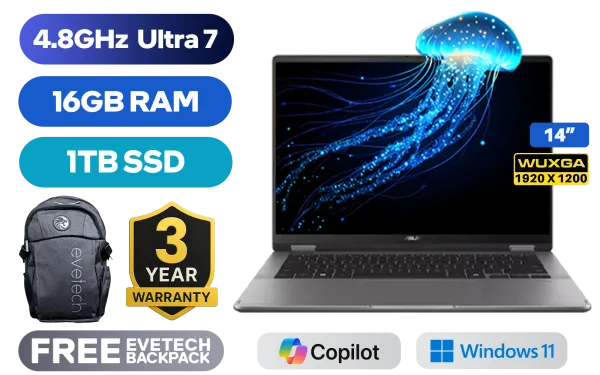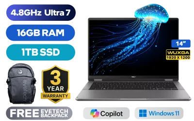 [TOUCHSCREEN] ASUS Vivobook 14 TP3407 Intel® Core™ Ultra 7-256V up to 4.8GHz Processor, 12MB Cache, 8x Cores, 8x Threads / 16GB LPDDR5X RAM / 1TB Ultra-Fast NVMe SSD / 14" WUXGA (1920x1200) OLED Display / Integrated Intel Arc 140V Graphics / Windows 11 Home (64bit) / Intel WiFi 7 BE201 Wireless LAN / Bluetooth 5.4 / FHD IR Camera with Privacy Shutter / 1x USB Type-A / 2x USB Type-C (Supports Thunderbolt 4 / DisplayPort / Power Delivery) / 1x HDMI / 1x Microphone & Headphone Combo Jack / Micro SD Card Reader / White Backlit Keyboard / SonicMaster Audio / Free Asus Pen / ASUS Vivobook 14 Flip TP3407 Core Ultra 7 Laptop Deal[TOUCHSCREEN] ASUS Vivobook 14 TP3407 Intel® Core™ Ultra 7-256V up to 4.8GHz Processor, 12MB Cache, 8x Cores, 8x Threads / 16GB LPDDR5X RAM / 1TB Ultra-Fast NVMe SSD / 14" WUXGA (1920x1200) OLED Display / Integrated Intel Arc 140V Graphics / Windows 11 Home (64bit) / Intel WiFi 7 BE201 Wireless LAN / Bluetooth 5.4 / FHD IR Camera with Privacy Shutter / 1x USB Type-A / 2x USB Type-C (Supports Thunderbolt 4 / DisplayPort / Power Delivery) / 1x HDMI / 1x Microphone & Headphone Combo Jack / Micro SD Card Reader / White Backlit Keyboard / SonicMaster Audio / Free Asus Pen / ASUS Vivobook 14 Flip TP3407 Core Ultra 7 Laptop Deal [TP3407SA-OU71610G1W] / [+] GET FREE EVETECH FLUX Premium Gaming Backpack / 3 YEARS WARRANTY + FREE DELIVERY !