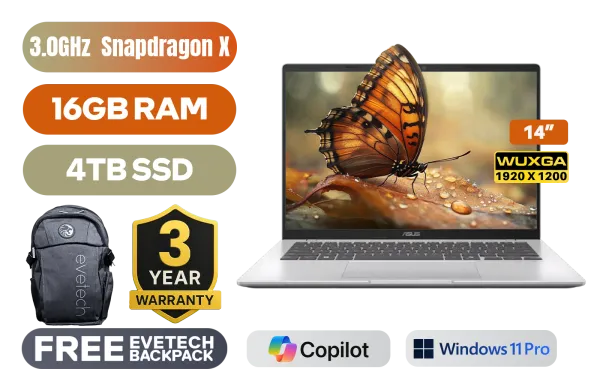 ASUS Vivobook 14 X1407QA Snapdragon X X1-26-100 up to 3.0GHz Processor, 30MB Cache, 8x Cores / 16GB LPDDR5x RAM / 4TB Ultra-Fast NVMe SSD / 14" WUXGA (1920x1200) Anti-Glare IPS-Level Display / Integrated Qualcomm Adreno Graphics / <span style="font-size: 20px; color: #00BFFF; font-weight: bold;">Windows 11 Professional (64bit)</span> / Qualcomm FastConnect 6900 Wi-Fi 6E Wireless LAN / Bluetooth 5.3 / 1080p FHD IR Camera with Privacy Shutter / 2x USB Type-A / 2x USB Type-C (Support DisplayPort / Power Delivery) / 1 x HDMI / 1x Microphone and Headphone Combo jack / White Backlit Keyboard / SonicMaster Audio / ASUS Vivobook 14 X1407QA Snapdragon X Laptop DealASUS Vivobook 14 X1407QA Snapdragon X X1-26-100 up to 3.0GHz Processor, 30MB Cache, 8x Cores / 16GB LPDDR5x RAM / 4TB Ultra-Fast NVMe SSD / 14" WUXGA (1920x1200) Anti-Glare IPS-Level Display / Integrated Qualcomm Adreno Graphics / Windows 11 Professional (64bit) / Qualcomm FastConnect 6900 Wi-Fi 6E Wireless LAN / Bluetooth 5.3 / 1080p FHD IR Camera with Privacy Shutter / 2x USB Type-A / 2x USB Type-C (Support DisplayPort / Power Delivery) / 1 x HDMI / 1x Microphone and Headphone Combo jack / White Backlit Keyboard / SonicMaster Audio / ASUS Vivobook 14 X1407QA Snapdragon X Laptop Deal [X1407QA-Q1610S0X/4TB] / [+] GET FREE EVETECH FLUX Premium Gaming Backpack / 3 YEARS WARRANTY + FREE DELIVERY !
