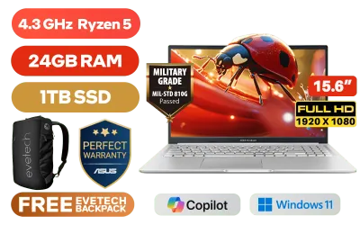 ASUS Vivobook 15 M1502YA AMD Ryzen 5 7430U Up to 4.3GHz Processor, 19MB Cache, 6x Cores, 12x Threads / 24GB DDR4 RAM / 1TB Ultra-Fast NVMe SSD / 15.6" FHD (1920 x 1080) Anti-Glare IPS-Level Display / Integrated AMD Radeon Graphics / Windows 11 Home (64bit) / MediaTek MT7902 Wi-Fi 6E Wireless LAN / Bluetooth 5.3 / 720p HD Web Camera With Privacy Shutter / 3x USB Type-A / 1x USB Type-C (Support Power Delivery) / 1x HDMI / 1 x Headphone & Microphone Audio Combo Jack / White Backlit Chicklet Keyboard / SonicMaster Audio / ASUS Vivobook 15 M1502YA AMD Ryzen 5 Laptop DealASUS Vivobook 15 M1502YA AMD Ryzen 5 7430U Up to 4.3GHz Processor, 19MB Cache, 6x Cores, 12x Threads / 24GB DDR4 RAM / 1TB Ultra-Fast NVMe SSD / 15.6" FHD (1920 x 1080) Anti-Glare IPS-Level Display / Integrated AMD Radeon Graphics / Windows 11 Home (64bit) / MediaTek MT7902 Wi-Fi 6E Wireless LAN / Bluetooth 5.3 / 720p HD Web Camera With Privacy Shutter / 3x USB Type-A / 1x USB Type-C (Support Power Delivery) / 1x HDMI / 1 x Headphone & Microphone Audio Combo Jack / White Backlit Chicklet Keyboard / SonicMaster Audio / ASUS Vivobook 15 M1502YA AMD Ryzen 5 Laptop Deal [M1502YA-58512S2W/24GB/1TB] / 3 YEARS WARRANTY / [+] GET FREE EVETECH NEO Premium Gaming Backpack+ FREE DELIVERY !