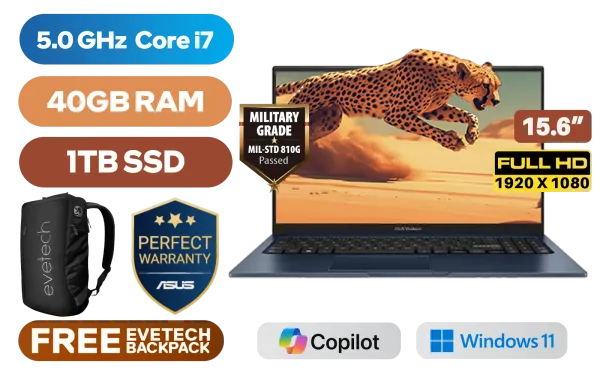 ASUS Vivobook 15 X1504VA Intel® 13th Generation Intel® Core™ i7-1355U Up to 5.0GHz Processor, 12MB Cache, 10x Cores, 12x Threads / 40GB DDR4 RAM / 1TB Ultra-Fast NVMe SSD / 15.6" FHD (1920 x 1080) Anti-Glare Display / Integrated Intel® UHD Graphics / Windows 11 Home (64bit) / Intel Wi-Fi AC9560 Wireless LAN / Bluetooth 5.3 / 720p HD Web Camera With Privacy Shutter / 3x USB Type-A / 1x USB Type-C / 1x HDMI / 1 x Headphone & Microphone Audio Combo Jack / White Backlit Chiclet Keyboard / SonicMaster Audio / ASUS Vivobook 15 X1504VA Intel® Core™ i7 Laptop DealASUS Vivobook 15 X1504VA Intel® 13th Generation Intel® Core™ i7-1355U Up to 5.0GHz Processor, 12MB Cache, 10x Cores, 12x Threads / 40GB DDR4 RAM / 1TB Ultra-Fast NVMe SSD / 15.6" FHD (1920 x 1080) Anti-Glare Display / Integrated Intel® UHD Graphics / Windows 11 Home (64bit) / Intel Wi-Fi AC9560 Wireless LAN / Bluetooth 5.3 / 720p HD Web Camera With Privacy Shutter / 3x USB Type-A / 1x USB Type-C / 1x HDMI / 1 x Headphone & Microphone Audio Combo Jack / White Backlit Chiclet Keyboard / SonicMaster Audio / ASUS Vivobook 15 X1504VA Intel® Core™ i7 Laptop Deal [X1504VA-I78512BL0W/40GB/1TB] / 3 YEARS WARRANTY / [+] GET FREE EVETECH NEO Premium Gaming Backpack / [+] GET FREE Logitech M185 Wireless Mouse+ FREE DELIVERY !