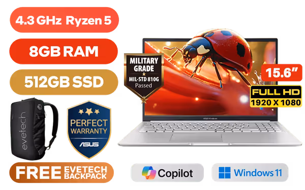 ASUS Vivobook 15 M1502YA AMD Ryzen 5 7430U Up to 4.3GHz Processor, 19MB Cache, 6x Cores, 12x Threads / 8GB DDR4 RAM / 512GB Ultra-Fast NVMe SSD / 15.6" FHD (1920 x 1080) Anti-Glare IPS-Level Display / Integrated AMD Radeon Graphics / Windows 11 Home (64bit) / MediaTek MT7902 Wi-Fi 6E Wireless LAN / Bluetooth 5.3 / 720p HD Web Camera With Privacy Shutter / 3x USB Type-A / 1x USB Type-C (Support Power Delivery) / 1x HDMI / 1 x Headphone & Microphone Audio Combo Jack / White Backlit Chicklet Keyboard / SonicMaster Audio / ASUS Vivobook 15 M1502YA AMD Ryzen 5 Laptop DealASUS Vivobook 15 M1502YA AMD Ryzen 5 7430U Up to 4.3GHz Processor, 19MB Cache, 6x Cores, 12x Threads / 8GB DDR4 RAM / 512GB Ultra-Fast NVMe SSD / 15.6" FHD (1920 x 1080) Anti-Glare IPS-Level Display / Integrated AMD Radeon Graphics / Windows 11 Home (64bit) / MediaTek MT7902 Wi-Fi 6E Wireless LAN / Bluetooth 5.3 / 720p HD Web Camera With Privacy Shutter / 3x USB Type-A / 1x USB Type-C (Support Power Delivery) / 1x HDMI / 1 x Headphone & Microphone Audio Combo Jack / White Backlit Chicklet Keyboard / SonicMaster Audio / ASUS Vivobook 15 M1502YA AMD Ryzen 5 Laptop Deal [M1502YA-58512S2W] / 3 YEARS WARRANTY / [+] GET FREE EVETECH NEO Premium Gaming Backpack+ FREE DELIVERY !