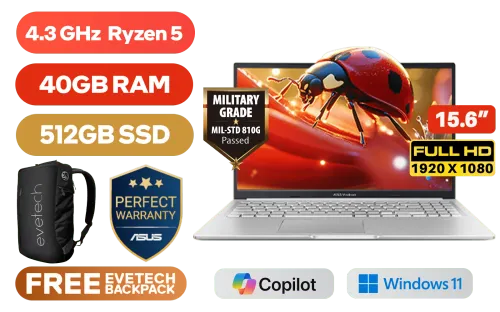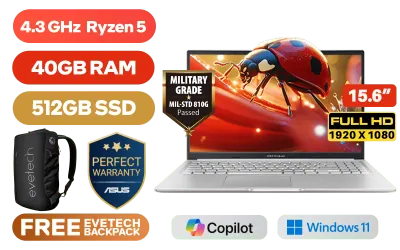 ASUS Vivobook 15 M1502YA AMD Ryzen 5 7430U Up to 4.3GHz Processor, 19MB Cache, 6x Cores, 12x Threads / 40GB DDR4 RAM / 512GB Ultra-Fast NVMe SSD / 15.6" FHD (1920 x 1080) Anti-Glare IPS-Level Display / Integrated AMD Radeon Graphics / Windows 11 Home (64bit) / MediaTek MT7902 Wi-Fi 6E Wireless LAN / Bluetooth 5.3 / 720p HD Web Camera With Privacy Shutter / 3x USB Type-A / 1x USB Type-C (Support Power Delivery) / 1x HDMI / 1 x Headphone & Microphone Audio Combo Jack / White Backlit Chicklet Keyboard / SonicMaster Audio / ASUS Vivobook 15 M1502YA AMD Ryzen 5 Laptop DealASUS Vivobook 15 M1502YA AMD Ryzen 5 7430U Up to 4.3GHz Processor, 19MB Cache, 6x Cores, 12x Threads / 40GB DDR4 RAM / 512GB Ultra-Fast NVMe SSD / 15.6" FHD (1920 x 1080) Anti-Glare IPS-Level Display / Integrated AMD Radeon Graphics / Windows 11 Home (64bit) / MediaTek MT7902 Wi-Fi 6E Wireless LAN / Bluetooth 5.3 / 720p HD Web Camera With Privacy Shutter / 3x USB Type-A / 1x USB Type-C (Support Power Delivery) / 1x HDMI / 1 x Headphone & Microphone Audio Combo Jack / White Backlit Chicklet Keyboard / SonicMaster Audio / ASUS Vivobook 15 M1502YA AMD Ryzen 5 Laptop Deal [M1502YA-58512S2W/40GB] / 3 YEARS WARRANTY / [+] GET FREE EVETECH NEO Premium Gaming Backpack+ FREE DELIVERY !