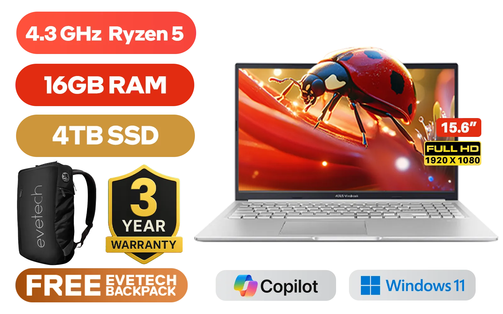 ASUS Vivobook 15 M1502YA AMD Ryzen 5 7430U Up to 4.3GHz Processor, 19MB Cache, 6x Cores, 12x Threads / 16GB DDR4 RAM / 4TB Ultra-Fast NVMe SSD / 15.6" FHD (1920 x 1080) Anti-Glare IPS-Level Display / Integrated AMD Radeon Graphics / Windows 11 Home (64bit) / MediaTek MT7902 Wi-Fi 6E Wireless LAN / Bluetooth 5.3 / 720p HD Web Camera With Privacy Shutter / 3x USB Type-A / 1x USB Type-C (Support Power Delivery) / 1x HDMI / 1 x Headphone & Microphone Audio Combo Jack / White Backlit Chicklet Keyboard / SonicMaster Audio / ASUS Vivobook 15 M1502YA AMD Ryzen 5 Laptop DealASUS Vivobook 15 M1502YA AMD Ryzen 5 7430U Up to 4.3GHz Processor, 19MB Cache, 6x Cores, 12x Threads / 16GB DDR4 RAM / 4TB Ultra-Fast NVMe SSD / 15.6" FHD (1920 x 1080) Anti-Glare IPS-Level Display / Integrated AMD Radeon Graphics / Windows 11 Home (64bit) / MediaTek MT7902 Wi-Fi 6E Wireless LAN / Bluetooth 5.3 / 720p HD Web Camera With Privacy Shutter / 3x USB Type-A / 1x USB Type-C (Support Power Delivery) / 1x HDMI / 1 x Headphone & Microphone Audio Combo Jack / White Backlit Chicklet Keyboard / SonicMaster Audio / ASUS Vivobook 15 M1502YA AMD Ryzen 5 Laptop Deal [M1502YA-58512S2W/16GB/4TB] / 3 YEARS WARRANTY / [+] GET FREE EVETECH DASH Premium Gaming Backpack+ FREE DELIVERY !