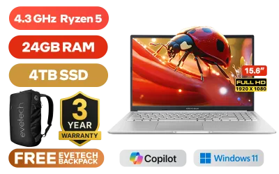 ASUS Vivobook 15 M1502YA AMD Ryzen 5 7430U Up to 4.3GHz Processor, 19MB Cache, 6x Cores, 12x Threads / 24GB DDR4 RAM / 4TB Ultra-Fast NVMe SSD / 15.6" FHD (1920 x 1080) Anti-Glare IPS-Level Display / Integrated AMD Radeon Graphics / Windows 11 Home (64bit) / MediaTek MT7902 Wi-Fi 6E Wireless LAN / Bluetooth 5.3 / 720p HD Web Camera With Privacy Shutter / 3x USB Type-A / 1x USB Type-C (Support Power Delivery) / 1x HDMI / 1 x Headphone & Microphone Audio Combo Jack / White Backlit Chicklet Keyboard / SonicMaster Audio / ASUS Vivobook 15 M1502YA AMD Ryzen 5 Laptop DealASUS Vivobook 15 M1502YA AMD Ryzen 5 7430U Up to 4.3GHz Processor, 19MB Cache, 6x Cores, 12x Threads / 24GB DDR4 RAM / 4TB Ultra-Fast NVMe SSD / 15.6" FHD (1920 x 1080) Anti-Glare IPS-Level Display / Integrated AMD Radeon Graphics / Windows 11 Home (64bit) / MediaTek MT7902 Wi-Fi 6E Wireless LAN / Bluetooth 5.3 / 720p HD Web Camera With Privacy Shutter / 3x USB Type-A / 1x USB Type-C (Support Power Delivery) / 1x HDMI / 1 x Headphone & Microphone Audio Combo Jack / White Backlit Chicklet Keyboard / SonicMaster Audio / ASUS Vivobook 15 M1502YA AMD Ryzen 5 Laptop Deal [M1502YA-58512S2W/24GB/4TB] / 3 YEARS WARRANTY / [+] GET FREE EVETECH NEO Premium Gaming Backpack+ FREE DELIVERY !