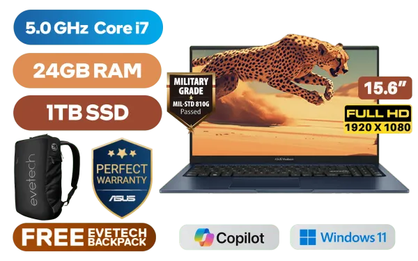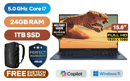 ASUS Vivobook 15 X1504VA Intel® 13th Generation Intel® Core™ i7-1355U Up to 5.0GHz Processor, 12MB Cache, 10x Cores, 12x Threads / 24GB DDR4 RAM / 1TB Ultra-Fast NVMe SSD / 15.6" FHD (1920 x 1080) Anti-Glare Display / Integrated Intel® UHD Graphics / Windows 11 Home (64bit) / Intel Wi-Fi AC9560 Wireless LAN / Bluetooth 5.3 / 720p HD Web Camera With Privacy Shutter / 3x USB Type-A / 1x USB Type-C / 1x HDMI / 1 x Headphone & Microphone Audio Combo Jack / White Backlit Chiclet Keyboard / SonicMaster Audio / ASUS Vivobook 15 X1504VA Intel® Core™ i7 Laptop DealASUS Vivobook 15 X1504VA Intel® 13th Generation Intel® Core™ i7-1355U Up to 5.0GHz Processor, 12MB Cache, 10x Cores, 12x Threads / 24GB DDR4 RAM / 1TB Ultra-Fast NVMe SSD / 15.6" FHD (1920 x 1080) Anti-Glare Display / Integrated Intel® UHD Graphics / Windows 11 Home (64bit) / Intel Wi-Fi AC9560 Wireless LAN / Bluetooth 5.3 / 720p HD Web Camera With Privacy Shutter / 3x USB Type-A / 1x USB Type-C / 1x HDMI / 1 x Headphone & Microphone Audio Combo Jack / White Backlit Chiclet Keyboard / SonicMaster Audio / ASUS Vivobook 15 X1504VA Intel® Core™ i7 Laptop Deal [X1504VA-I78512BL0W/24GB/1TB] / 3 YEARS WARRANTY / [+] GET FREE EVETECH NEO Premium Gaming Backpack / [+] GET FREE Logitech M185 Wireless Mouse+ FREE DELIVERY !