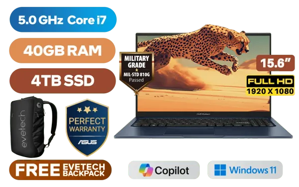 ASUS Vivobook 15 X1504VA Intel® 13th Generation Intel® Core™ i7-1355U Up to 5.0GHz Processor, 12MB Cache, 10x Cores, 12x Threads / 40GB DDR4 RAM / 4TB Ultra-Fast NVMe SSD / 15.6" FHD (1920 x 1080) Anti-Glare Display / Integrated Intel® UHD Graphics / Windows 11 Home (64bit) / Intel Wi-Fi AC9560 Wireless LAN / Bluetooth 5.3 / 720p HD Web Camera With Privacy Shutter / 3x USB Type-A / 1x USB Type-C / 1x HDMI / 1 x Headphone & Microphone Audio Combo Jack / White Backlit Chiclet Keyboard / SonicMaster Audio / ASUS Vivobook 15 X1504VA Intel® Core™ i7 Laptop DealASUS Vivobook 15 X1504VA Intel® 13th Generation Intel® Core™ i7-1355U Up to 5.0GHz Processor, 12MB Cache, 10x Cores, 12x Threads / 40GB DDR4 RAM / 4TB Ultra-Fast NVMe SSD / 15.6" FHD (1920 x 1080) Anti-Glare Display / Integrated Intel® UHD Graphics / Windows 11 Home (64bit) / Intel Wi-Fi AC9560 Wireless LAN / Bluetooth 5.3 / 720p HD Web Camera With Privacy Shutter / 3x USB Type-A / 1x USB Type-C / 1x HDMI / 1 x Headphone & Microphone Audio Combo Jack / White Backlit Chiclet Keyboard / SonicMaster Audio / ASUS Vivobook 15 X1504VA Intel® Core™ i7 Laptop Deal [X1504VA-I78512BL0W/40GB/4TB] / 3 YEARS WARRANTY / [+] GET FREE EVETECH NEO Premium Gaming Backpack / [+] GET FREE Logitech M185 Wireless Mouse+ FREE DELIVERY !