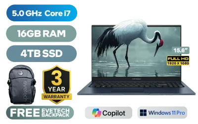 ASUS Vivobook 15 X1504VA Intel Core i7-1355U up to 5.0GHz Processor, 12MB Cache, 10x Cores, 12x Threads / 16GB DDR4 RAM / 4TB Ultra-Fast NVMe SSD / 15.6" FHD (1920 x 1080) Anti-glare Display / Integrated Intel Iris® Xe Graphics / <span style="color:blue; font-size: 17px;">Windows 11 Professional (64bit)</span> / Intel Wireless-AC 9560 Wireless LAN / Bluetooth 5.1 / 720p HD Camera with Privacy Shutter / 3x USB Type-A / 1x USB Type-C / 1x HDMI / 1x Microphone & Headphone Combo Jack / White Backlit Keyboard / Built-in Speaker and Microphone with SonicMaster Audio / ASUS Vivobook 15 X1504VA Intel Core i7 Laptop DealASUS Vivobook 15 X1504VA Intel Core i7-1355U up to 5.0GHz Processor, 12MB Cache, 10x Cores, 12x Threads / 16GB DDR4 RAM / 4TB Ultra-Fast NVMe SSD / 15.6" FHD (1920 x 1080) Anti-glare Display / Integrated Intel Iris® Xe Graphics / Windows 11 Professional (64bit) / Intel Wireless-AC 9560 Wireless LAN / Bluetooth 5.1 / 720p HD Camera with Privacy Shutter / 3x USB Type-A / 1x USB Type-C / 1x HDMI / 1x Microphone & Headphone Combo Jack / White Backlit Keyboard / Built-in Speaker and Microphone with SonicMaster Audio / ASUS Vivobook 15 X1504VA Intel Core i7 Laptop Deal [X1504VA-I716512BL0X/4TB] / [+] GET FREE EVETECH FLUX Premium Gaming Backpack / 3 YEARS WARRANTY + FREE DELIVERY !