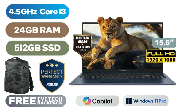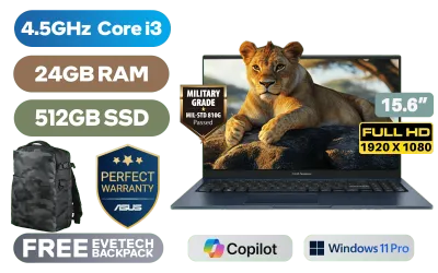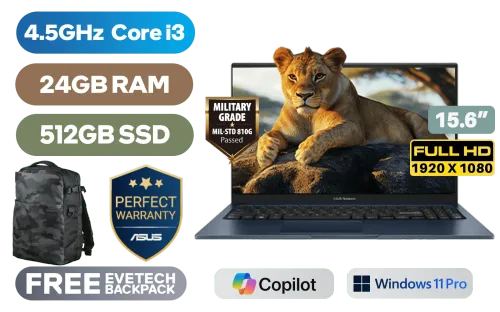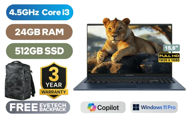 ASUS Vivobook 15 X1504VA Intel® 13th Generation Intel® Core™ i3-1315U Up to 4.5GHz Processor, 10MB Cache, 6x Cores, 8x Threads / 24GB DDR4 RAM / 512GB Ultra-Fast NVMe SSD / 15.6" FHD (1920x1080) Anti-Glare Display / Integrated Intel® UHD Graphics / <span style="font-size: 20px; color: #00BFFF; font-weight: bold;">Windows 11 Professional (64bit)</span> / MediaTek WiFi 6E MT7902 Wireless LAN / Bluetooth 5.3 / 720p HD Camera With Privacy Shutter / 3x USB Type-A / 1x USB Type-C / 1x HDMI / 1 x Headphone & Microphone Combo Jack / White Backlit Keyboard / SonicMaster Audio / ASUS Vivobook 15 X1504VA Core i3 Laptop DealASUS Vivobook 15 X1504VA Intel® 13th Generation Intel® Core™ i3-1315U Up to 4.5GHz Processor, 10MB Cache, 6x Cores, 8x Threads / 24GB DDR4 RAM / 512GB Ultra-Fast NVMe SSD / 15.6" FHD (1920x1080) Anti-Glare Display / Integrated Intel® UHD Graphics / Windows 11 Professional (64bit) / MediaTek WiFi 6E MT7902 Wireless LAN / Bluetooth 5.3 / 720p HD Camera With Privacy Shutter / 3x USB Type-A / 1x USB Type-C / 1x HDMI / 1 x Headphone & Microphone Combo Jack / White Backlit Keyboard / SonicMaster Audio / ASUS Vivobook 15 X1504VA Core i3 Laptop Deal [X1504VA-I316512BL0X/24GB] / [+] GET FREE EVETECH DASH Premium Gaming Backpack / 3 YEARS WARRANTY + FREE DELIVERY !