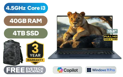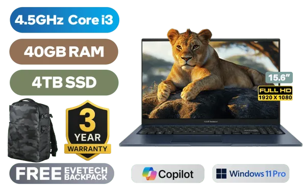 ASUS Vivobook 15 X1504VA Intel® 13th Generation Intel® Core™ i3-1315U Up to 4.5GHz Processor, 10MB Cache, 6x Cores, 8x Threads / 40GB DDR4 RAM / 4TB Ultra-Fast NVMe SSD / 15.6" FHD (1920x1080) Anti-Glare Display / Integrated Intel® UHD Graphics / <span style="font-size: 20px; color: #00BFFF; font-weight: bold;">Windows 11 Professional (64bit)</span> / MediaTek WiFi 6E MT7902 Wireless LAN / Bluetooth 5.3 / 720p HD Camera With Privacy Shutter / 3x USB Type-A / 1x USB Type-C / 1x HDMI / 1 x Headphone & Microphone Combo Jack / White Backlit Keyboard / SonicMaster Audio / ASUS Vivobook 15 X1504VA Core i3 Laptop DealASUS Vivobook 15 X1504VA Intel® 13th Generation Intel® Core™ i3-1315U Up to 4.5GHz Processor, 10MB Cache, 6x Cores, 8x Threads / 40GB DDR4 RAM / 4TB Ultra-Fast NVMe SSD / 15.6" FHD (1920x1080) Anti-Glare Display / Integrated Intel® UHD Graphics / Windows 11 Professional (64bit) / MediaTek WiFi 6E MT7902 Wireless LAN / Bluetooth 5.3 / 720p HD Camera With Privacy Shutter / 3x USB Type-A / 1x USB Type-C / 1x HDMI / 1 x Headphone & Microphone Combo Jack / White Backlit Keyboard / SonicMaster Audio / ASUS Vivobook 15 X1504VA Core i3 Laptop Deal [X1504VA-I316512BL0X/40GB/4TB] / [+] GET FREE EVETECH DASH Premium Gaming Backpack / 3 YEARS WARRANTY + FREE DELIVERY !