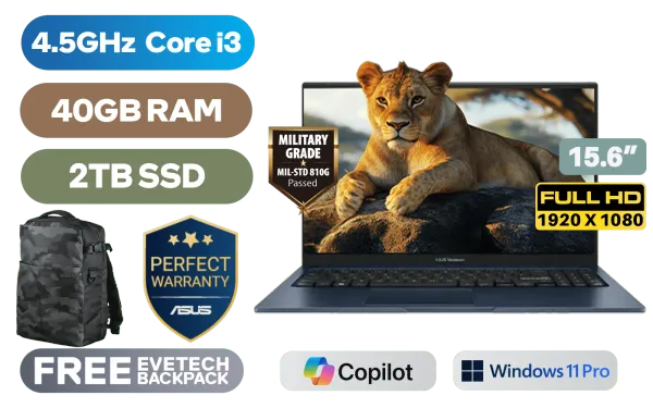 ASUS Vivobook 15 X1504VA Intel® 13th Generation Intel® Core™ i3-1315U Up to 4.5GHz Processor, 10MB Cache, 6x Cores, 8x Threads / 40GB DDR4 RAM / 2TB Ultra-Fast NVMe SSD / 15.6" FHD (1920x1080) Anti-Glare Display / Integrated Intel® UHD Graphics / <span style="font-size: 20px; color: #00BFFF; font-weight: bold;">Windows 11 Professional (64bit)</span> / MediaTek WiFi 6E MT7902 Wireless LAN / Bluetooth 5.3 / 720p HD Camera With Privacy Shutter / 3x USB Type-A / 1x USB Type-C / 1x HDMI / 1 x Headphone & Microphone Combo Jack / White Backlit Keyboard / SonicMaster Audio / ASUS Vivobook 15 X1504VA Core i3 Laptop DealASUS Vivobook 15 X1504VA Intel® 13th Generation Intel® Core™ i3-1315U Up to 4.5GHz Processor, 10MB Cache, 6x Cores, 8x Threads / 40GB DDR4 RAM / 2TB Ultra-Fast NVMe SSD / 15.6" FHD (1920x1080) Anti-Glare Display / Integrated Intel® UHD Graphics / Windows 11 Professional (64bit) / MediaTek WiFi 6E MT7902 Wireless LAN / Bluetooth 5.3 / 720p HD Camera With Privacy Shutter / 3x USB Type-A / 1x USB Type-C / 1x HDMI / 1 x Headphone & Microphone Combo Jack / White Backlit Keyboard / SonicMaster Audio / ASUS Vivobook 15 X1504VA Core i3 Laptop Deal [X1504VA-I316512BL0X/40GB/2TB] / [+] GET FREE EVETECH DASH Premium Gaming Backpack / 3 YEARS WARRANTY + FREE DELIVERY !