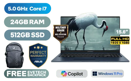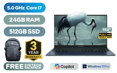 ASUS Vivobook 15 X1504VA Intel Core i7-1355U up to 5.0GHz Processor, 12MB Cache, 10x Cores, 12x Threads / 24GB DDR4 RAM / 512GB Ultra-Fast NVMe SSD / 15.6" FHD (1920 x 1080) Anti-glare Display / Integrated Intel Iris® Xe Graphics / <span style="color:blue; font-size: 17px;">Windows 11 Professional (64bit)</span> / Intel Wireless-AC 9560 Wireless LAN / Bluetooth 5.1 / 720p HD Camera with Privacy Shutter / 3x USB Type-A / 1x USB Type-C / 1x HDMI / 1x Microphone & Headphone Combo Jack / White Backlit Keyboard / Built-in Speaker and Microphone with SonicMaster Audio / ASUS Vivobook 15 X1504VA Intel Core i7 Laptop DealASUS Vivobook 15 X1504VA Intel Core i7-1355U up to 5.0GHz Processor, 12MB Cache, 10x Cores, 12x Threads / 24GB DDR4 RAM / 512GB Ultra-Fast NVMe SSD / 15.6" FHD (1920 x 1080) Anti-glare Display / Integrated Intel Iris® Xe Graphics / Windows 11 Professional (64bit) / Intel Wireless-AC 9560 Wireless LAN / Bluetooth 5.1 / 720p HD Camera with Privacy Shutter / 3x USB Type-A / 1x USB Type-C / 1x HDMI / 1x Microphone & Headphone Combo Jack / White Backlit Keyboard / Built-in Speaker and Microphone with SonicMaster Audio / ASUS Vivobook 15 X1504VA Intel Core i7 Laptop Deal [X1504VA-I716512BL0X/24GB] / [+] GET FREE EVETECH FLUX Premium Gaming Backpack / 3 YEARS WARRANTY + FREE DELIVERY !