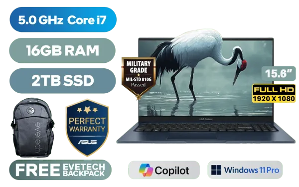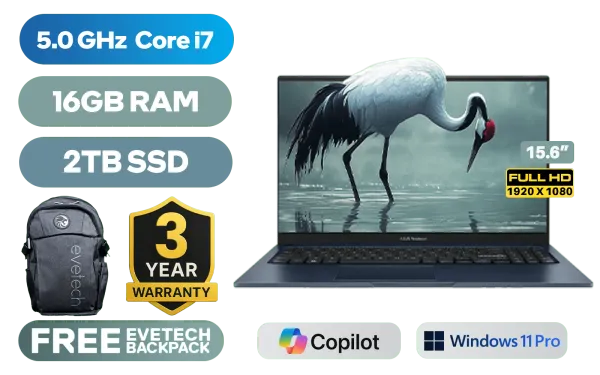 ASUS Vivobook 15 X1504VA Intel Core i7-1355U up to 5.0GHz Processor, 12MB Cache, 10x Cores, 12x Threads / 16GB DDR4 RAM / 2TB Ultra-Fast NVMe SSD / 15.6" FHD (1920 x 1080) Anti-glare Display / Integrated Intel Iris® Xe Graphics / <span style="color:blue; font-size: 17px;">Windows 11 Professional (64bit)</span> / Intel Wireless-AC 9560 Wireless LAN / Bluetooth 5.1 / 720p HD Camera with Privacy Shutter / 3x USB Type-A / 1x USB Type-C / 1x HDMI / 1x Microphone & Headphone Combo Jack / White Backlit Keyboard / Built-in Speaker and Microphone with SonicMaster Audio / ASUS Vivobook 15 X1504VA Intel Core i7 Laptop DealASUS Vivobook 15 X1504VA Intel Core i7-1355U up to 5.0GHz Processor, 12MB Cache, 10x Cores, 12x Threads / 16GB DDR4 RAM / 2TB Ultra-Fast NVMe SSD / 15.6" FHD (1920 x 1080) Anti-glare Display / Integrated Intel Iris® Xe Graphics / Windows 11 Professional (64bit) / Intel Wireless-AC 9560 Wireless LAN / Bluetooth 5.1 / 720p HD Camera with Privacy Shutter / 3x USB Type-A / 1x USB Type-C / 1x HDMI / 1x Microphone & Headphone Combo Jack / White Backlit Keyboard / Built-in Speaker and Microphone with SonicMaster Audio / ASUS Vivobook 15 X1504VA Intel Core i7 Laptop Deal [X1504VA-I716512BL0X/2TB] / [+] GET FREE EVETECH FLUX Premium Gaming Backpack / 3 YEARS WARRANTY + FREE DELIVERY !