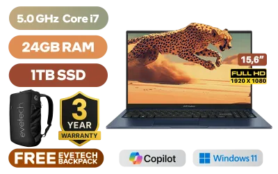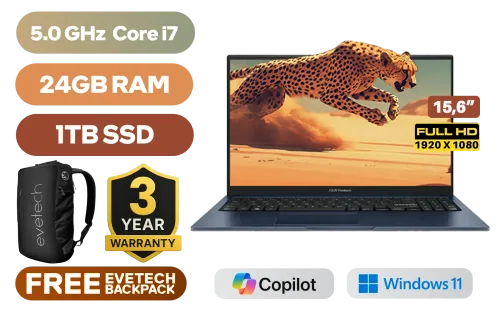 ASUS Vivobook 15 X1504VA Intel® 13th Generation Intel® Core™ i7-1355U Up to 5.0GHz Processor, 12MB Cache, 10x Cores, 12x Threads / 24GB DDR4 RAM / 1TB Ultra-Fast NVMe SSD / 15.6" FHD (1920 x 1080) Anti-Glare Display / Integrated Intel® UHD Graphics / Windows 11 Home (64bit) / Intel Wi-Fi AC9560 Wireless LAN / Bluetooth 5.3 / 720p HD Web Camera With Privacy Shutter / 3x USB Type-A / 1x USB Type-C / 1x HDMI / 1 x Headphone & Microphone Audio Combo Jack / White Backlit Chiclet Keyboard / SonicMaster Audio / ASUS Vivobook 15 X1504VA Intel® Core™ i7 Laptop DealASUS Vivobook 15 X1504VA Intel® 13th Generation Intel® Core™ i7-1355U Up to 5.0GHz Processor, 12MB Cache, 10x Cores, 12x Threads / 24GB DDR4 RAM / 1TB Ultra-Fast NVMe SSD / 15.6" FHD (1920 x 1080) Anti-Glare Display / Integrated Intel® UHD Graphics / Windows 11 Home (64bit) / Intel Wi-Fi AC9560 Wireless LAN / Bluetooth 5.3 / 720p HD Web Camera With Privacy Shutter / 3x USB Type-A / 1x USB Type-C / 1x HDMI / 1 x Headphone & Microphone Audio Combo Jack / White Backlit Chiclet Keyboard / SonicMaster Audio / ASUS Vivobook 15 X1504VA Intel® Core™ i7 Laptop Deal [X1504VA-I78512BL0W/24GB/1TB] / 3 YEARS WARRANTY / [+] GET FREE EVETECH NEO Premium Gaming Backpack / [+] GET FREE Logitech M185 Wireless Mouse+ FREE DELIVERY !