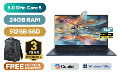 Asus Vivobook 15 X1504VAP Intel Core 5 120U up to 5.0GHz, 12MB Cache Processor, 10x Cores, 12x Threads / 24GB DDR4 RAM / 512GB Ultra-Fast NVME SSD / 15.6" FHD (1920x1080) Anti-glare IPS-Level Display / Integrated Intel® Graphics / <span style="color:blue; font-size: 17px;">Windows 11 Professional (64bit)</span> / Realtek 8851BE Wireless LAN / Bluetooth 5.2 / 720P HD Camera / 3x USB Type-A / 1x USB Type-C / 1x HDMI / 1x Microphone and Headphone Combo Jack / Kensington Lock / Non-Backlit Chicklet Keyboard / Asus Vivobook 15 X1504VAP Core 5 120U Laptop DealAsus Vivobook 15 X1504VAP Intel Core 5 120U up to 5.0GHz, 12MB Cache Processor, 10x Cores, 12x Threads / 24GB DDR4 RAM / 512GB Ultra-Fast NVME SSD / 15.6" FHD (1920x1080) Anti-glare IPS-Level Display / Integrated Intel® Graphics / Windows 11 Professional (64bit) / Realtek 8851BE Wireless LAN / Bluetooth 5.2 / 720P HD Camera / 3x USB Type-A / 1x USB Type-C / 1x HDMI / 1x Microphone and Headphone Combo Jack / Kensington Lock / Non-Backlit Chicklet Keyboard / Asus Vivobook 15 X1504VAP Core 5 120U Laptop Deal [X1504VAP-I516512BL0X-3YRS/24GB] / 3 YEARS WARRANTY / [+] GET FREE EVETECH DASH Premium Gaming Backpack+ FREE DELIVERY !