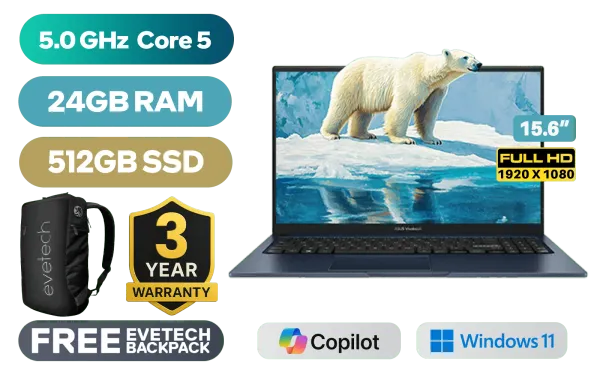 Asus Vivobook 15 X1504VAP Intel Core 5 120U up to 5.0GHz, 12MB Cache Processor, 10x Cores, 12x Threads / 24GB DDR4 RAM / 512GB Ultra-Fast NVME SSD / 15.6" FHD (1920x1080) IPS-Glare Display / Integrated Intel® Graphics / Windows 11 Home (64bit) / Realtek WiFi 6E 8851BE Wireless LAN / Bluetooth 5.3 / 720P HD Camera / 3x USB Type-A / 1x USB Type-C / 1x HDMI / 1x Microphone and Headphone Combo Jack / White Backlit Keyboard / SonicMaster Audio / Asus Vivobook 15 X1504VAP Intel Core 5 120U Laptop DealAsus Vivobook 15 X1504VAP Intel Core 5 120U up to 5.0GHz, 12MB Cache Processor, 10x Cores, 12x Threads / 24GB DDR4 RAM / 512GB Ultra-Fast NVME SSD / 15.6" FHD (1920x1080) IPS-Glare Display / Integrated Intel® Graphics / Windows 11 Home (64bit) / Realtek WiFi 6E 8851BE Wireless LAN / Bluetooth 5.3 / 720P HD Camera / 3x USB Type-A / 1x USB Type-C / 1x HDMI / 1x Microphone and Headphone Combo Jack / White Backlit Keyboard / SonicMaster Audio / Asus Vivobook 15 X1504VAP Intel Core 5 120U Laptop Deal [X1504VAP-I516512BL3W/24GB] / 3 YEARS WARRANTY / [+] GET FREE EVETECH NEO Premium Gaming Backpack+ FREE DELIVERY !