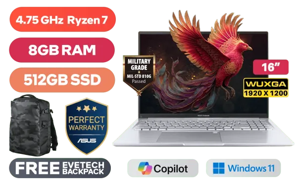 ASUS Vivobook 16 M1605NAQ AMD Ryzen 7 170 up to 4.75GHz Processor, 20MB Cache, 8x Cores, 16x Threads / 8GB DDR5 RAM / 512GB Ultra-Fast NVMe SSD / 16" WUXGA (1920x1200) Anti-Glare Display / Integrated AMD Radeon 680M Graphics / Windows 11 Home (64bit) / MediaTek Wi-Fi 6 MT7920 Wireless LAN / Bluetooth 5.4 / 720p HD Camera With Privacy Shutter / 3x USB 3.2 Type-A / 2x USB Type-C (Supports Power Delivery) / 1x HDMI / 1x Headphone and microphone Combo Jack / White Backlit Keyboard / SonicMaster Audio / ASUS Vivobook 16 M1605NAQ Ryzen 7 Laptop DealASUS Vivobook 16 M1605NAQ AMD Ryzen 7 170 up to 4.75GHz Processor, 20MB Cache, 8x Cores, 16x Threads / 8GB DDR5 RAM / 512GB Ultra-Fast NVMe SSD / 16" WUXGA (1920x1200) Anti-Glare Display / Integrated AMD Radeon 680M Graphics / Windows 11 Home (64bit) / MediaTek Wi-Fi 6 MT7920 Wireless LAN / Bluetooth 5.4 / 720p HD Camera With Privacy Shutter / 3x USB 3.2 Type-A / 2x USB Type-C (Supports Power Delivery) / 1x HDMI / 1x Headphone and microphone Combo Jack / White Backlit Keyboard / SonicMaster Audio / ASUS Vivobook 16 M1605NAQ Ryzen 7 Laptop Deal [M1605NAQ-78512S0W] / 3 YEARS WARRANTY / [+] GET FREE EVETECH DASH Premium Gaming Backpack+ FREE DELIVERY !