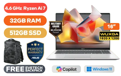 ASUS Vivobook 16 M1607GA AMD Ryzen™ AI 7-445 up to 4.6GHz Processor, 14MB Cache, 6x Cores, 12x Threads / 32GB DDR5 RAM / 512GB Ultra-Fast NVMe SSD / 16" WUXGA (1920x1200) IPS-Level Display / Integrated Radeon Graphics / Windows 11 Home (64bit) / MediaTek WiFi 6 MT7920 Wireless LAN / Bluetooth 5.4 / FHD IR Camera with Privacy Shutter / 2 x USB Type-A / 2x USB Type-C (Supports DisplayPort / Power Delviery) / 1 x HDMI / 1x Microphone & Headphone Combo jack / White Backlit Keyboard / SonicMaster Audio / ASUS Vivobook 16 M1607GA Ryzen AI 7 Laptop DealASUS Vivobook 16 M1607GA AMD Ryzen™ AI 7-445 up to 4.6GHz Processor, 14MB Cache, 6x Cores, 12x Threads / 32GB DDR5 RAM / 512GB Ultra-Fast NVMe SSD / 16" WUXGA (1920x1200) IPS-Level Display / Integrated Radeon Graphics / Windows 11 Home (64bit) / MediaTek WiFi 6 MT7920 Wireless LAN / Bluetooth 5.4 / FHD IR Camera with Privacy Shutter / 2 x USB Type-A / 2x USB Type-C (Supports DisplayPort / Power Delviery) / 1 x HDMI / 1x Microphone & Headphone Combo jack / White Backlit Keyboard / SonicMaster Audio / ASUS Vivobook 16 M1607GA Ryzen AI 7 Laptop Deal [M1607GA-716512S0W/32GB] / 3 YEARS WARRANTY / [+] GET FREE EVETECH DASH Premium Gaming Backpack+ FREE DELIVERY !