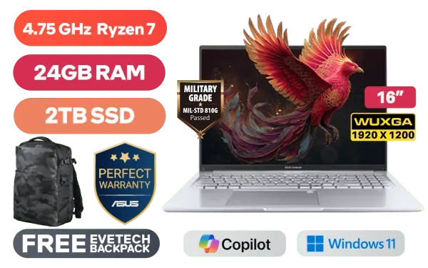 ASUS Vivobook 16 M1605NAQ AMD Ryzen 7 170 up to 4.75GHz Processor, 20MB Cache, 8x Cores, 16x Threads / 24GB DDR5 RAM / 2TB Ultra-Fast NVMe SSD / 16" WUXGA (1920x1200) Anti-Glare Display / Integrated AMD Radeon 680M Graphics / Windows 11 Home (64bit) / MediaTek Wi-Fi 6 MT7920 Wireless LAN / Bluetooth 5.4 / 720p HD Camera With Privacy Shutter / 3x USB 3.2 Type-A / 2x USB Type-C (Supports Power Delivery) / 1x HDMI / 1x Headphone and microphone Combo Jack / White Backlit Keyboard / SonicMaster Audio / ASUS Vivobook 16 M1605NAQ Ryzen 7 Laptop DealASUS Vivobook 16 M1605NAQ AMD Ryzen 7 170 up to 4.75GHz Processor, 20MB Cache, 8x Cores, 16x Threads / 24GB DDR5 RAM / 2TB Ultra-Fast NVMe SSD / 16" WUXGA (1920x1200) Anti-Glare Display / Integrated AMD Radeon 680M Graphics / Windows 11 Home (64bit) / MediaTek Wi-Fi 6 MT7920 Wireless LAN / Bluetooth 5.4 / 720p HD Camera With Privacy Shutter / 3x USB 3.2 Type-A / 2x USB Type-C (Supports Power Delivery) / 1x HDMI / 1x Headphone and microphone Combo Jack / White Backlit Keyboard / SonicMaster Audio / ASUS Vivobook 16 M1605NAQ Ryzen 7 Laptop Deal [M1605NAQ-78512S0W/24GB/2TB] / 3 YEARS WARRANTY / [+] GET FREE EVETECH DASH Premium Gaming Backpack+ FREE DELIVERY !