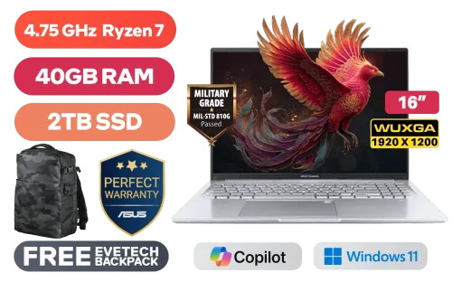 ASUS Vivobook 16 M1605NAQ AMD Ryzen 7 170 up to 4.75GHz Processor, 20MB Cache, 8x Cores, 16x Threads / 40GB DDR5 RAM / 2TB Ultra-Fast NVMe SSD / 16" WUXGA (1920x1200) Anti-Glare Display / Integrated AMD Radeon 680M Graphics / Windows 11 Home (64bit) / MediaTek Wi-Fi 6 MT7920 Wireless LAN / Bluetooth 5.4 / 720p HD Camera With Privacy Shutter / 3x USB 3.2 Type-A / 2x USB Type-C (Supports Power Delivery) / 1x HDMI / 1x Headphone and microphone Combo Jack / White Backlit Keyboard / SonicMaster Audio / ASUS Vivobook 16 M1605NAQ Ryzen 7 Laptop DealASUS Vivobook 16 M1605NAQ AMD Ryzen 7 170 up to 4.75GHz Processor, 20MB Cache, 8x Cores, 16x Threads / 40GB DDR5 RAM / 2TB Ultra-Fast NVMe SSD / 16" WUXGA (1920x1200) Anti-Glare Display / Integrated AMD Radeon 680M Graphics / Windows 11 Home (64bit) / MediaTek Wi-Fi 6 MT7920 Wireless LAN / Bluetooth 5.4 / 720p HD Camera With Privacy Shutter / 3x USB 3.2 Type-A / 2x USB Type-C (Supports Power Delivery) / 1x HDMI / 1x Headphone and microphone Combo Jack / White Backlit Keyboard / SonicMaster Audio / ASUS Vivobook 16 M1605NAQ Ryzen 7 Laptop Deal [M1605NAQ-78512S0W/40GB/2TB] / 3 YEARS WARRANTY / [+] GET FREE EVETECH DASH Premium Gaming Backpack+ FREE DELIVERY !