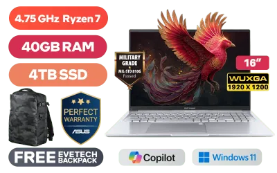 ASUS Vivobook 16 M1605NAQ AMD Ryzen 7 170 up to 4.75GHz Processor, 20MB Cache, 8x Cores, 16x Threads / 40GB DDR5 RAM / 4TB Ultra-Fast NVMe SSD / 16" WUXGA (1920x1200) Anti-Glare Display / Integrated AMD Radeon 680M Graphics / Windows 11 Home (64bit) / MediaTek Wi-Fi 6 MT7920 Wireless LAN / Bluetooth 5.4 / 720p HD Camera With Privacy Shutter / 3x USB 3.2 Type-A / 2x USB Type-C (Supports Power Delivery) / 1x HDMI / 1x Headphone and microphone Combo Jack / White Backlit Keyboard / SonicMaster Audio / ASUS Vivobook 16 M1605NAQ Ryzen 7 Laptop DealASUS Vivobook 16 M1605NAQ AMD Ryzen 7 170 up to 4.75GHz Processor, 20MB Cache, 8x Cores, 16x Threads / 40GB DDR5 RAM / 4TB Ultra-Fast NVMe SSD / 16" WUXGA (1920x1200) Anti-Glare Display / Integrated AMD Radeon 680M Graphics / Windows 11 Home (64bit) / MediaTek Wi-Fi 6 MT7920 Wireless LAN / Bluetooth 5.4 / 720p HD Camera With Privacy Shutter / 3x USB 3.2 Type-A / 2x USB Type-C (Supports Power Delivery) / 1x HDMI / 1x Headphone and microphone Combo Jack / White Backlit Keyboard / SonicMaster Audio / ASUS Vivobook 16 M1605NAQ Ryzen 7 Laptop Deal [M1605NAQ-78512S0W/40GB/4TB] / 3 YEARS WARRANTY / [+] GET FREE EVETECH DASH Premium Gaming Backpack+ FREE DELIVERY !