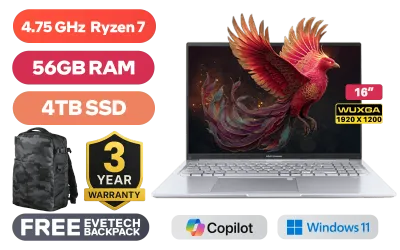 ASUS Vivobook 16 M1605NAQ AMD Ryzen 7 170 up to 4.75GHz Processor, 20MB Cache, 8x Cores, 16x Threads / 56GB DDR5 RAM / 4TB Ultra-Fast NVMe SSD / 16" WUXGA (1920x1200) Anti-Glare Display / Integrated AMD Radeon 680M Graphics / Windows 11 Home (64bit) / MediaTek Wi-Fi 6 MT7920 Wireless LAN / Bluetooth 5.4 / 720p HD Camera With Privacy Shutter / 3x USB 3.2 Type-A / 2x USB Type-C (Supports Power Delivery) / 1x HDMI / 1x Headphone and microphone Combo Jack / White Backlit Keyboard / SonicMaster Audio / ASUS Vivobook 16 M1605NAQ Ryzen 7 Laptop DealASUS Vivobook 16 M1605NAQ AMD Ryzen 7 170 up to 4.75GHz Processor, 20MB Cache, 8x Cores, 16x Threads / 56GB DDR5 RAM / 4TB Ultra-Fast NVMe SSD / 16" WUXGA (1920x1200) Anti-Glare Display / Integrated AMD Radeon 680M Graphics / Windows 11 Home (64bit) / MediaTek Wi-Fi 6 MT7920 Wireless LAN / Bluetooth 5.4 / 720p HD Camera With Privacy Shutter / 3x USB 3.2 Type-A / 2x USB Type-C (Supports Power Delivery) / 1x HDMI / 1x Headphone and microphone Combo Jack / White Backlit Keyboard / SonicMaster Audio / ASUS Vivobook 16 M1605NAQ Ryzen 7 Laptop Deal [M1605NAQ-78512S0W/56GB/4TB] / 3 YEARS WARRANTY / [+] GET FREE EVETECH DASH Premium Gaming Backpack+ FREE DELIVERY !
